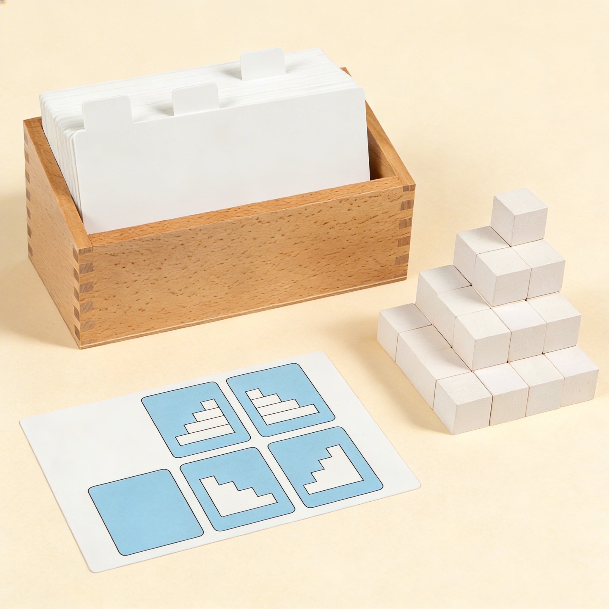 Jednotné bílé kostky eliminují barvu jako vizuální nápovědu a vyžadují od dětí zaměření čistě na prostorové vztahy a formu. Tato návrhová volba posiluje vizuálně-prostorové zpracování a brání dětem spoléhat se na barevné vzory, čímž činí výzvu prostorového uvažování autentičtější a přenositelnou na aplikace v reálném světě.