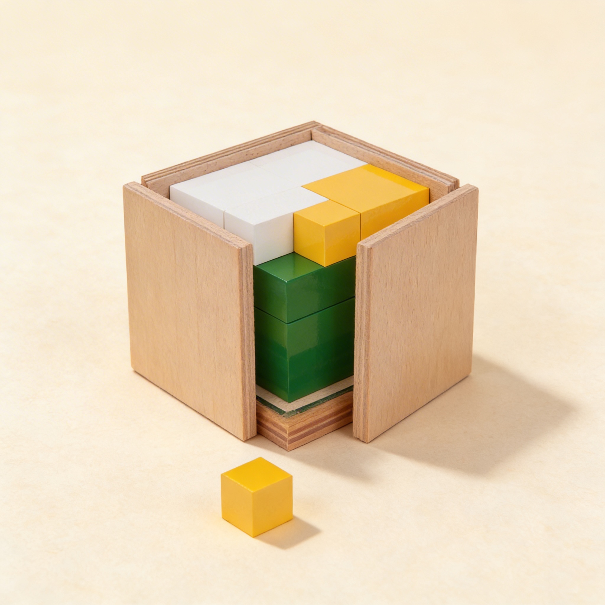 Krychle Mocniny Dvojky představuje dětem binární postup, exponenciální růst a mocniny dvojky (1, 2, 4, 8, 16, 32, 64, 128, 256, 512). Poskytuje konkrétní, trojrozměrné znázornění toho, jak se čísla v sekvenci zdvojují, činí abstraktní matematické vztahy hmatatelnými prostřednictvím praktické manipulace.
