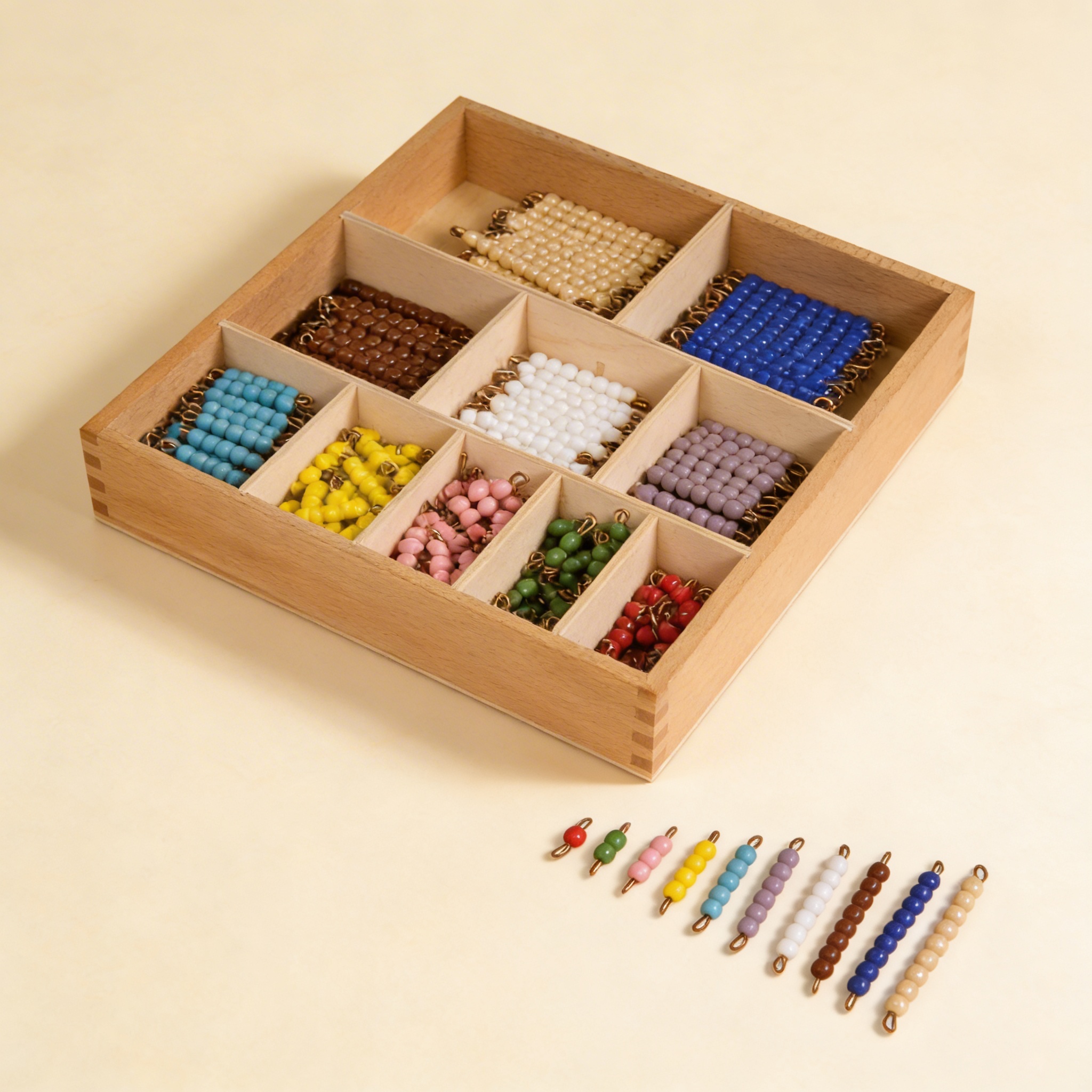 Jede einzelne Perle besteht aus hochwertigem Glas und bietet das perfekte Gewicht und die taktile Erfahrung für präzises Zählen und mathematische Manipulation. Das Glasmaterial gewährleistet Langlebigkeit und erhält die authentische Montessori-Sinneserfahrung, die das Lernen unterstützt.