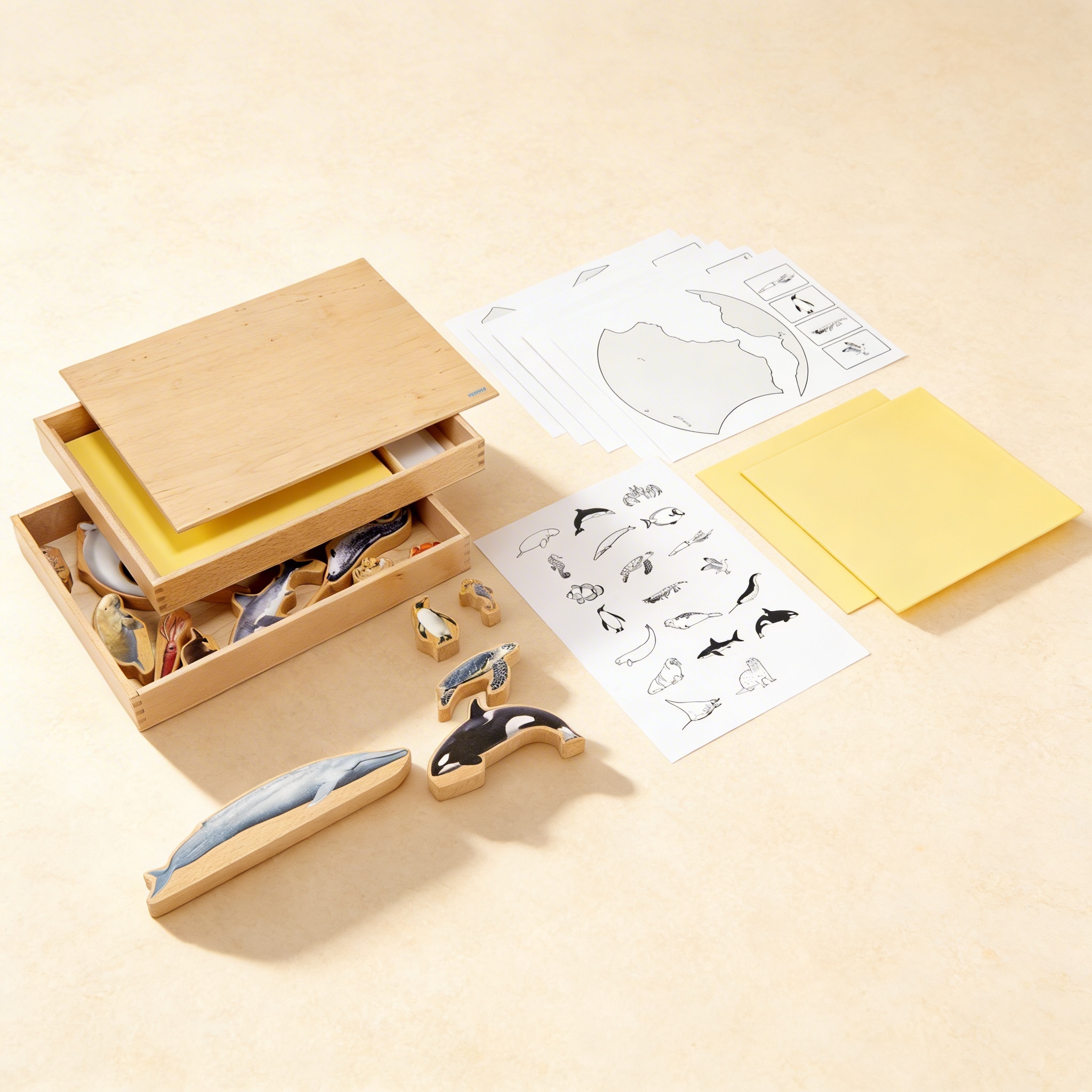 Die Meerestiere Box ist ein umfassendes Montessori-Sinnesmaterial, das Kinder in die Klassifizierung und den Wortschatz des Meereslebens einführt. Dieses mehrstufige Holzaufbewahrungssystem enthält realistische Meerestierfiguren mit passenden Klassifizierungskarten, die es Kindern ermöglichen, die marine Biodiversität durch praktische Sortier- und Zuordnungsaktivitäten zu erkunden. Das Material unterstützt die Entwicklung der visuellen Unterscheidungsfähigkeit, Wortschatzerweiterung und das Verständnis für Meeresökosysteme.