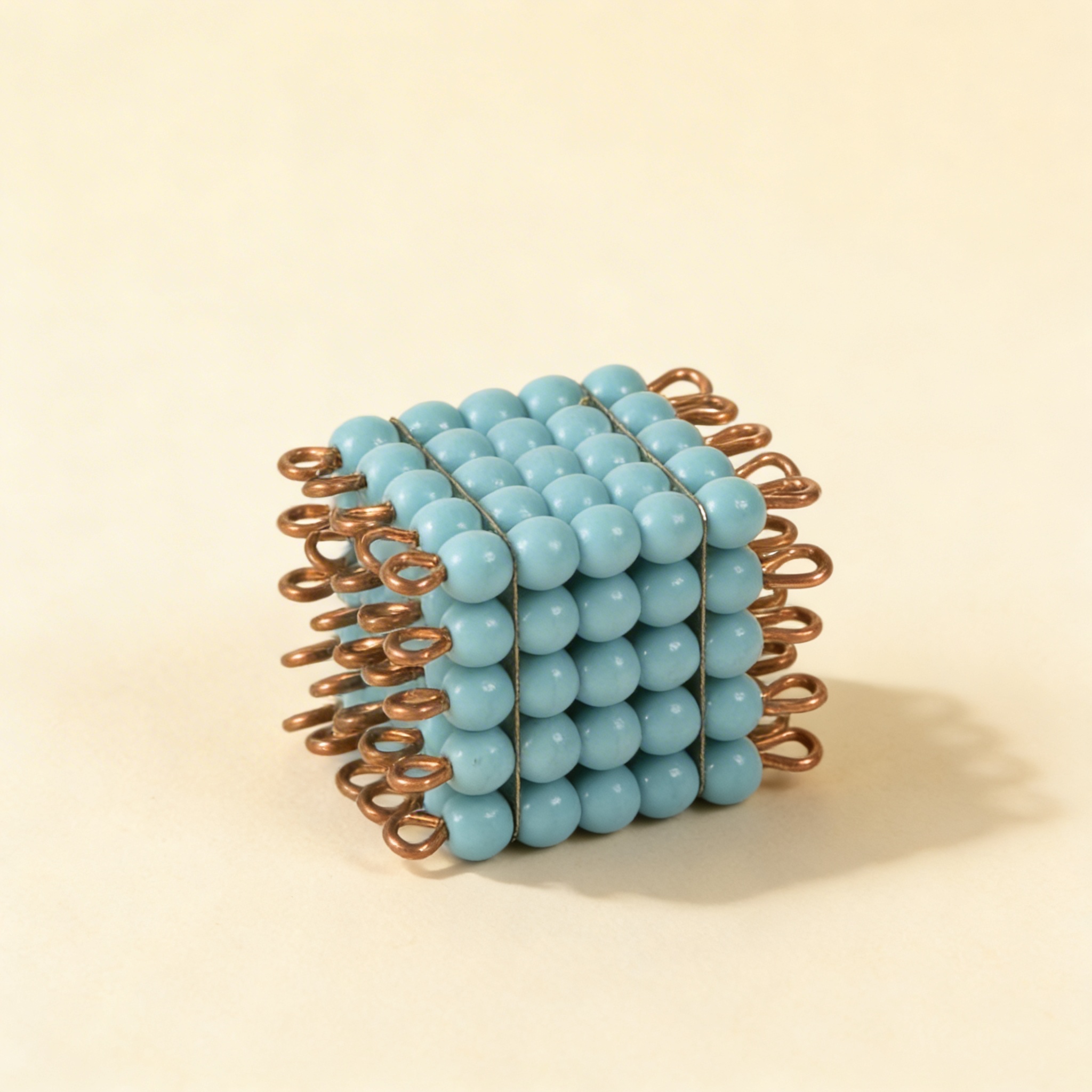Dieser einzelne Glasperlen-Würfel von 5 besteht aus hellblauen Glasperlen in einer präzisen 5×5×5-Formation und repräsentiert 125 Einheiten bei der konkreten Erforschung des Kubierens. Als Teil der Perlenwürfel-Serie bietet dieses Material eine taktile und visuelle Darstellung mathematischer Konzepte und ermöglicht Kindern, die dritte Potenz von fünf durch Zählen, Berühren und Untersuchen der dreidimensionalen Struktur physisch zu erfahren.