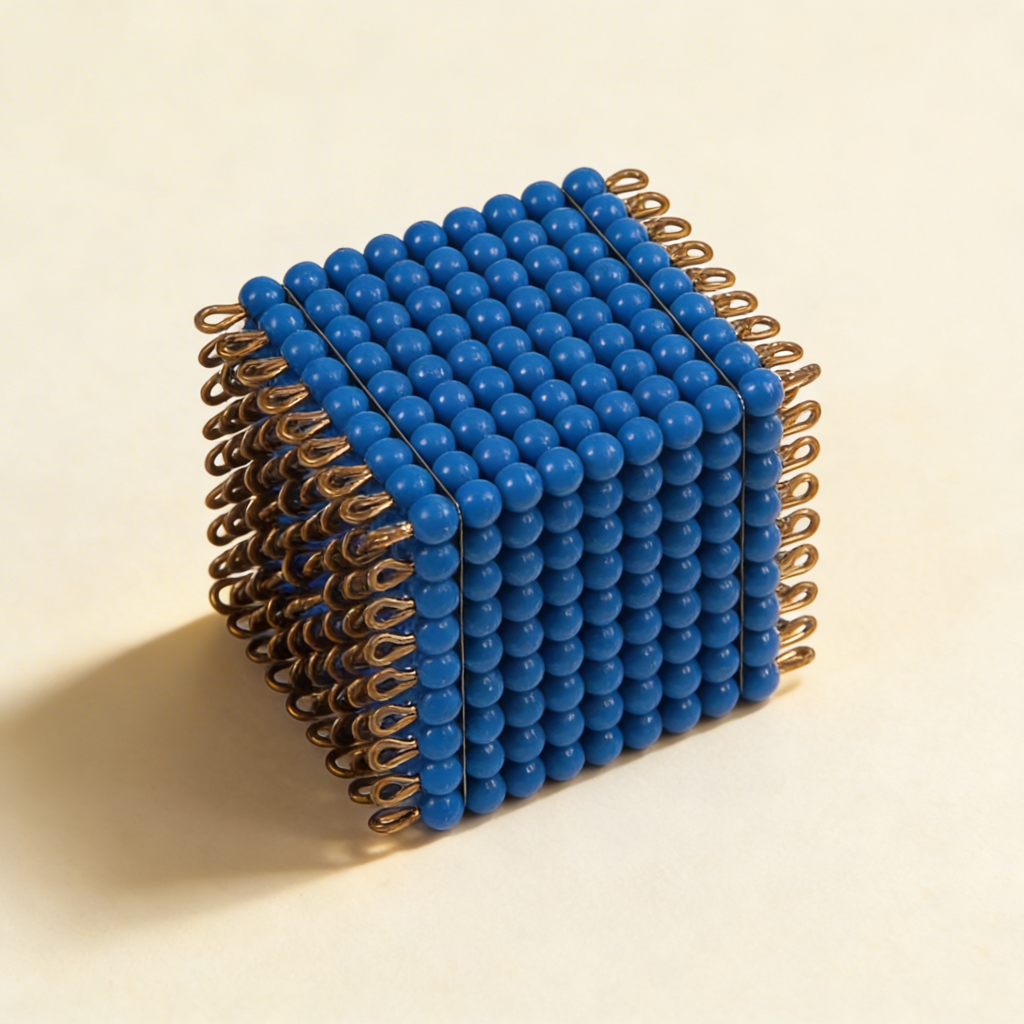 Der Würfel enthält 729 einzelne dunkelblaue Nylonperlen (9x9x9), die präzise auf kupferfarbenen Draht aufgezogen sind. Jede Kante misst 9 Perlen in der Länge und bildet einen perfekten Würfel, den Kinder zählen, berühren und manipulieren können, um Volumen und Menge zu verstehen.