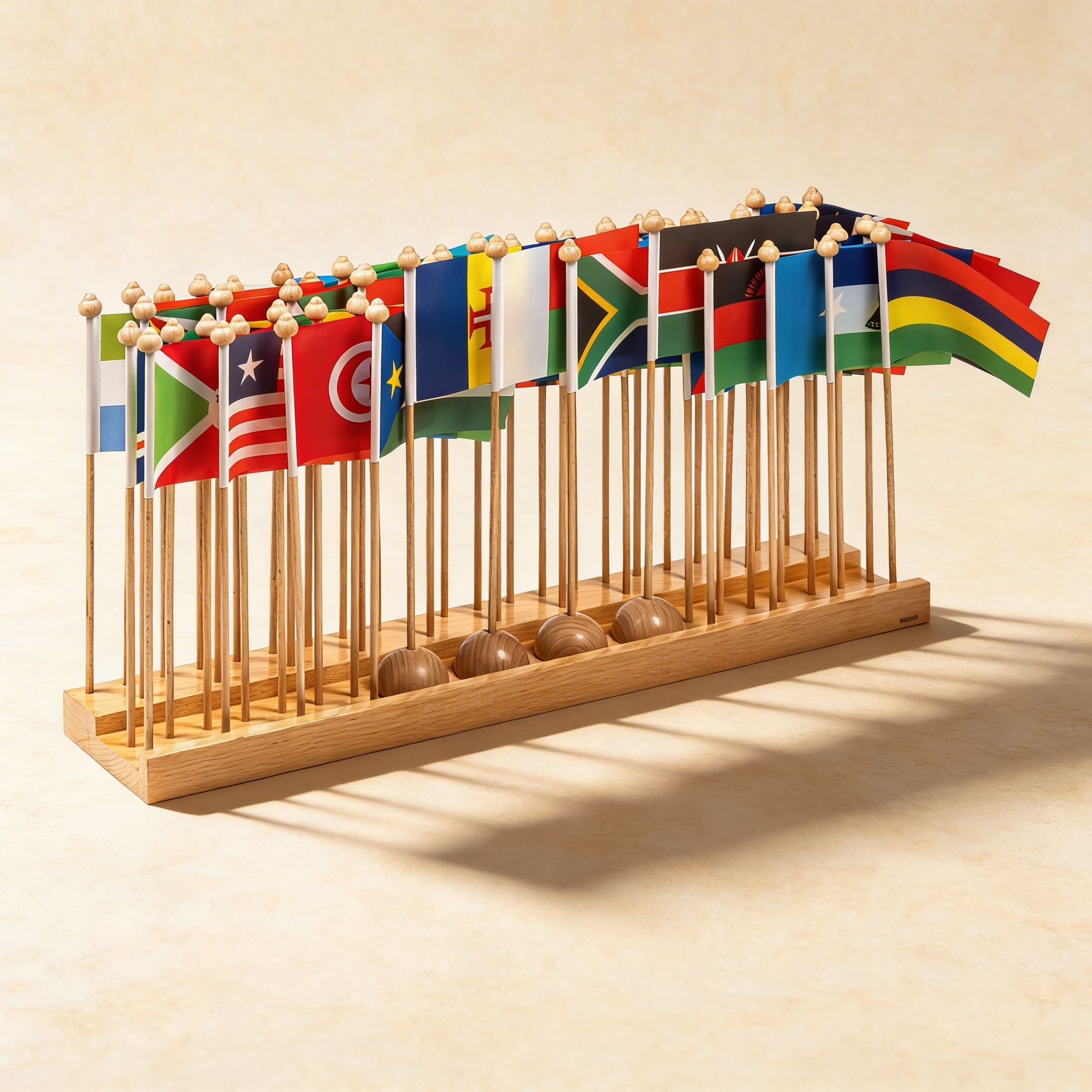 Der Flaggenständer für Afrika veranschaulicht Montessoris Betonung der kosmischen Erziehung und kulturellen Wertschätzung. Durch die Darstellung afrikanischer Nationen mittels ihrer Flaggen würdigt dieses Material Dr. Montessoris Vision von Kindern als Weltbürger, die von früh an Respekt für Vielfalt entwickeln. Der konkrete, manipulative Charakter ermöglicht es Kindern, abstrakte Konzepte der Geographie und Nationalität durch sinnliche Erfahrung zu erforschen. Der selbstkorrigierende Aspekt entsteht durch die wachsende Vertrautheit des Kindes mit den einzigartigen Eigenschaften jeder Flagge. Dieses Material unterstützt das Montessori-Prinzip des Übergangs vom Konkreten zum Abstrakten, da Kinder Flaggen zunächst als schöne Objekte erleben, bevor sie ihre tiefere Bedeutung als Symbole von Nationen und Kulturen verstehen. Die geordnete Präsentation auf dem Holzständer spiegelt Montessoris Betonung von Schönheit und Organisation in der vorbereiteten Umgebung wider und lädt zu konzentrierter Erforschung ein, während sie das Ordnungsgefühl des Kindes und die Wertschätzung für das reiche kulturelle Mosaik des afrikanischen Kontinents entwickelt.