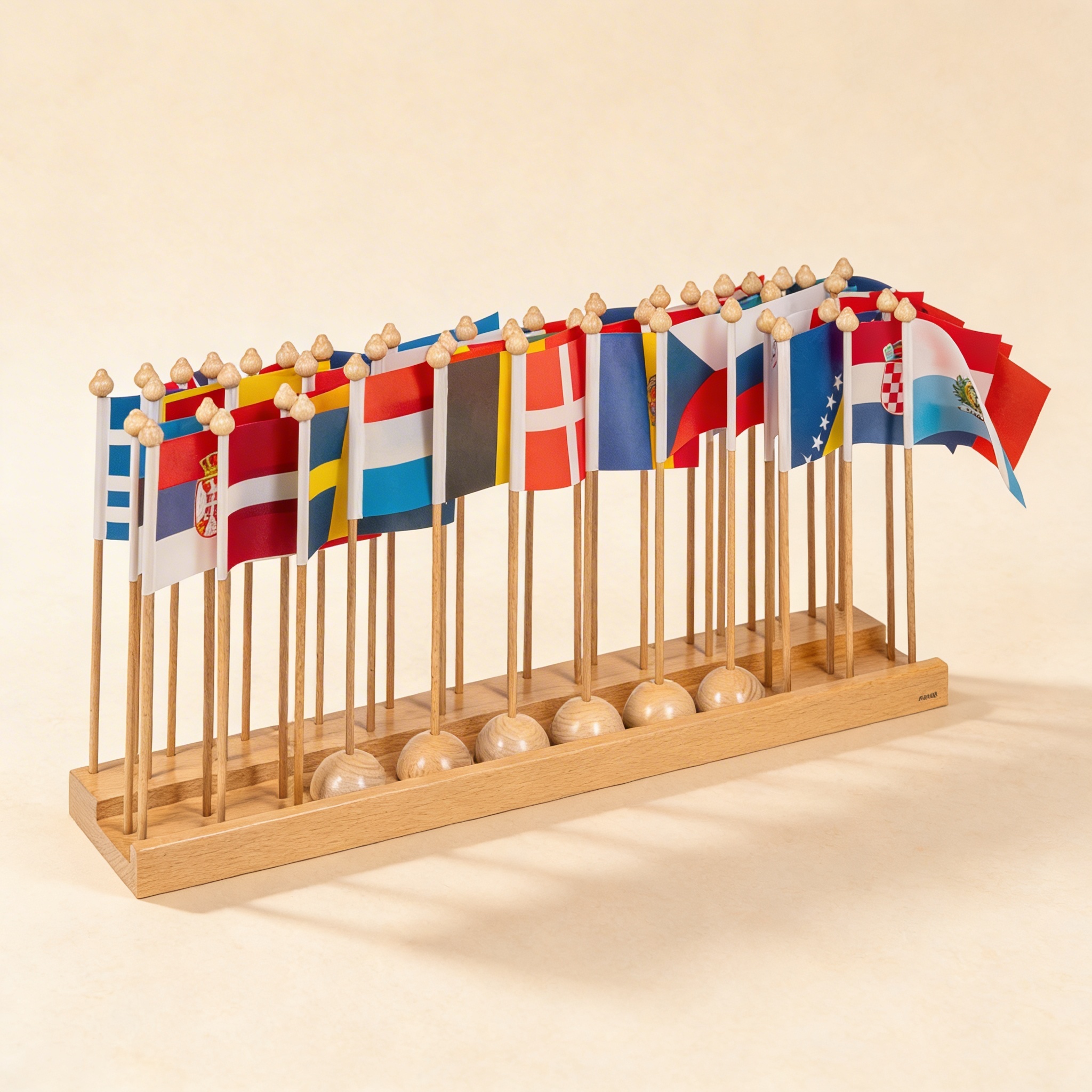 Der Flaggenständer von Europa verkörpert Montessoris Prinzipien der kulturellen Bildung, indem er konkrete, sensorielle Erforschung abstrakter geographischer Konzepte ermöglicht. Dieses Material ehrt die natürliche Neugierde des Kindes auf die Welt und respektiert gleichzeitig sein entwicklungsbedingtes Bedürfnis nach Ordnung und Klassifikation. Die selbstkorrigierende Natur ermöglicht eigenständige Entdeckung und fördert intrinsische Motivation statt externer Bestätigung. Jede Flagge stellt ein konkretes Symbol dar, das Kinder manipulieren können und dabei neuronale Verbindungen vom konkreten zum abstrakten Denken aufbauen. Die schöne Handwerkskunst spiegelt Montessoris Überzeugung wider, dass Kinder ästhetisch ansprechende Materialien verdienen, die Ehrfurcht vor dem Lernen inspirieren. Durch die Einbeziehung mehrerer Sinne durch taktile Manipulation und visuelle Erkennung unterstützt dieses Material die Entwicklung des ganzen Kindes. Die systematische Anordnung befriedigt die sensible Phase des Kindes für Ordnung, während der kulturelle Inhalt das erwachsende soziale Bewusstsein nährt. Dieses Material verwandelt abstrakte Geographie in greifbare, bedeutungsvolle Erforschung und ermöglicht es Kindern, ihr Verständnis der europäischen Vielfalt durch direkte Erfahrung statt passiven Unterricht aufzubauen.