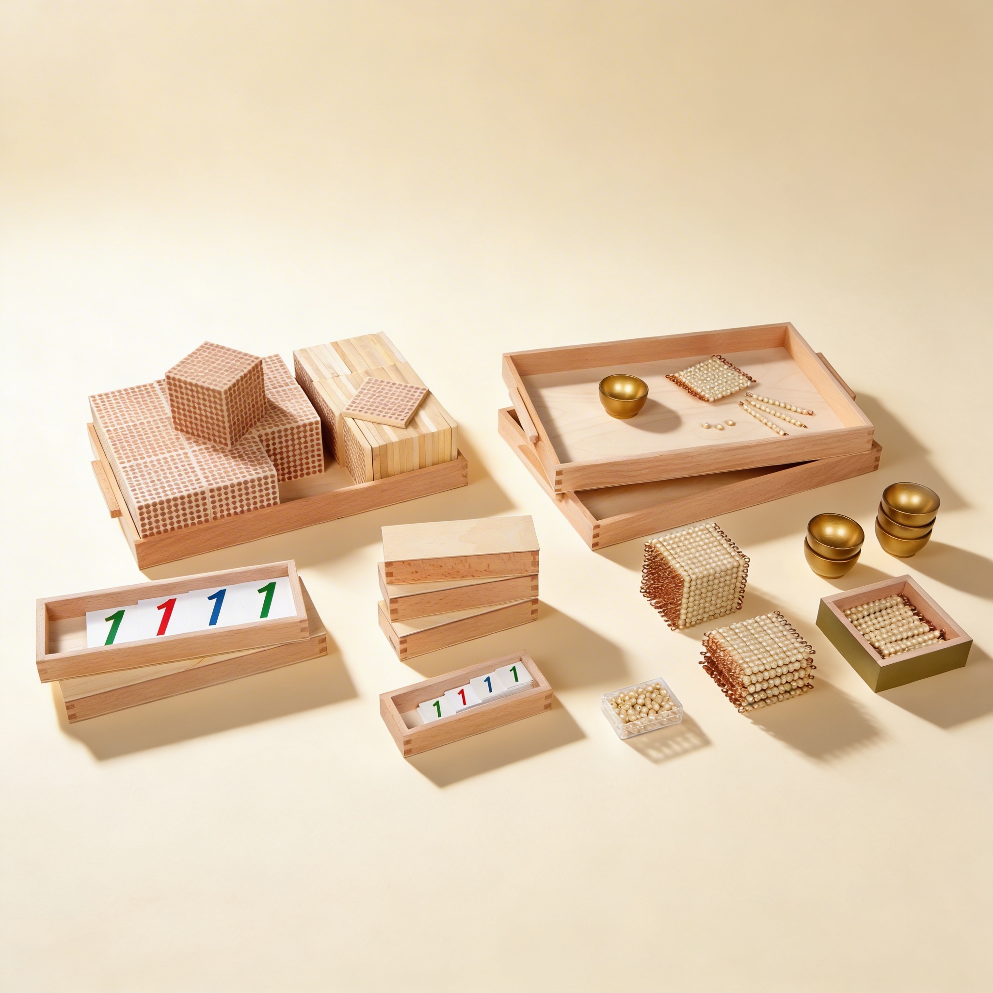 Das Goldene Perlenmaterial verkörpert Dr. Montessoris revolutionären Ansatz zur mathematischen Bildung durch konkrete sinnliche Erfahrung. Durch die Bereitstellung physischer Darstellungen abstrakter numerischer Konzepte würdigt dieses Material das Bedürfnis des Kindes, durch Handhabung und Bewegung zu lernen. Die goldenen Glasperlen schaffen eine visuelle Hierarchie, die Kinder natürlich vom konkreten Verständnis zum abstrakten Denken führt und das Montessori-Prinzip verkörpert, vom Einfachen zum Komplexen zu gehen. Jede Perle repräsentiert eine Einheit von eins und macht Mathematik greifbar und bedeutungsvoll. Die selbstkorrigierende Natur des Materials ermöglicht es Kindern, mathematische Beziehungen selbstständig zu entdecken, fördert intrinsische Motivation und tiefes konzeptionelles Verständnis. Die organisierte Darbietung in Holztabletts spiegelt Montessoris Betonung von Ordnung und Schönheit in der Lernumgebung wider, während die hochwertigen Materialien Respekt für die Arbeit und das Potenzial des Kindes demonstrieren.