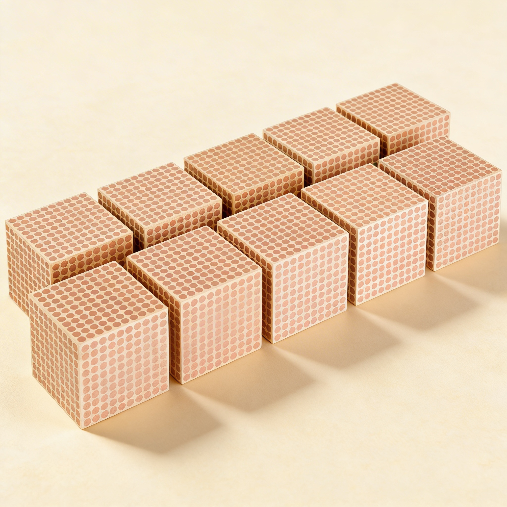 Dieses Set aus 10 hölzernen Tausenderwürfeln erweitert das mathematische Verständnis durch konkrete Manipulation großer Mengen. Jeder Würfel zeigt ein gedrucktes Gittermuster, das 1.000 Einheitswürfel darstellt und ermöglicht Kindern die Erforschung von Stellenwerten, Dezimalsystem-Konzepten und mathematischen Operationen mit Tausendern im Montessori-Mathematik-Curriculum.