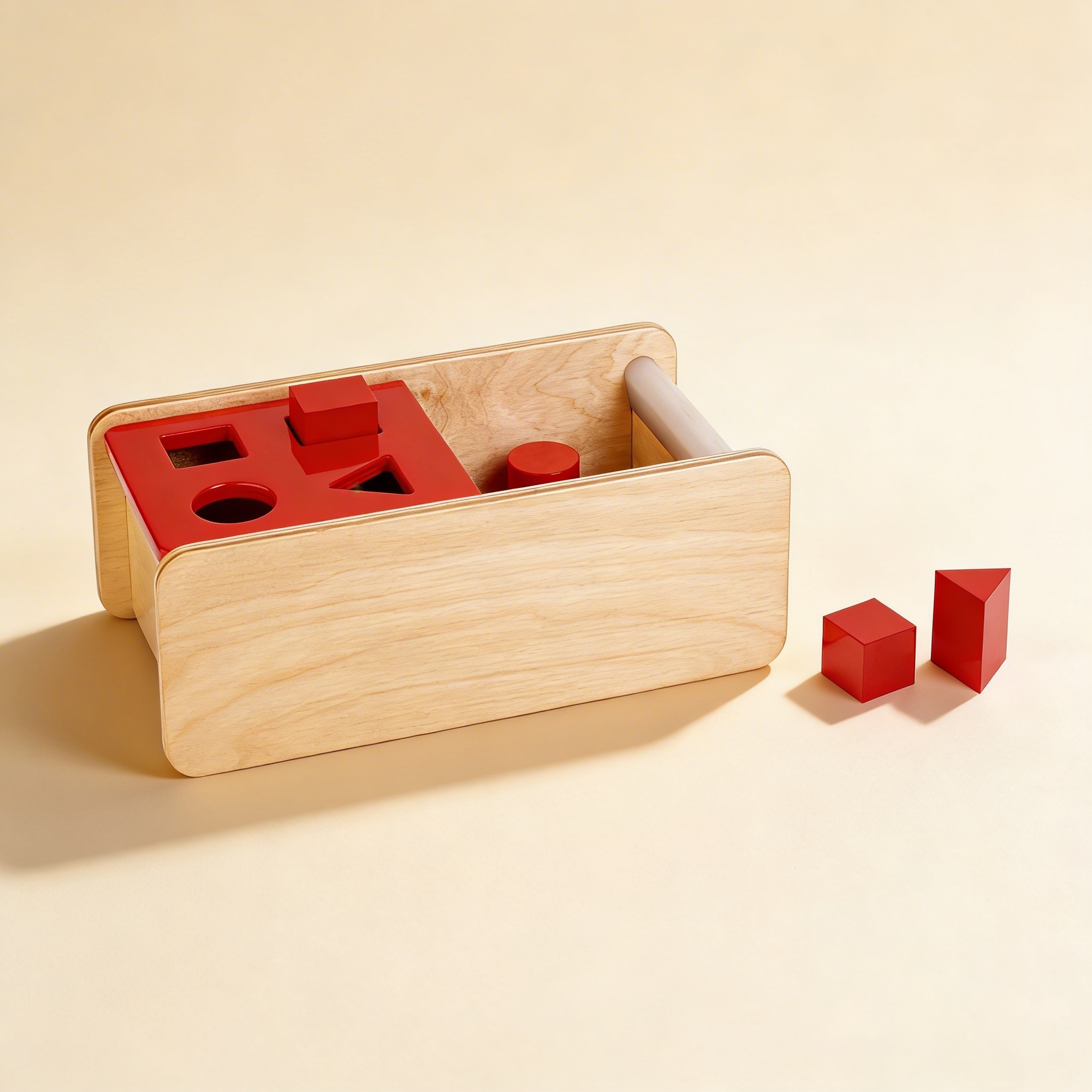 Die Imbucare Box mit Klappdeckel verkörpert Montessoris Prinzip der Isolierung der Schwierigkeit, indem sie Formunterscheidung zusammen mit dem Konzept der Objektpermanenz präsentiert. Dieses Material respektiert die sensible Phase des Kindes für Ordnung und Bewegung und ermöglicht wiederholende Übung, die ihren inneren Drang nach Beherrschung befriedigt. Das Klappdeckel-Design fügt zweckmäßige Komplexität hinzu und erfordert koordinierte Bewegungen, die die Hand auf zukünftige Schreibaufgaben vorbereiten. Dem Prinzip der Fehlerkontrolle folgend, passt jede Form nur in ihren entsprechenden Schlitz, was Selbstkorrektur ohne Eingreifen Erwachsener ermöglicht. Dieses Material überbrückt die Lücke zwischen einfachen Greifaktivitäten und komplexerer Manipulationsarbeit und unterstützt die Reise des Kindes zur Unabhängigkeit und Konzentration.