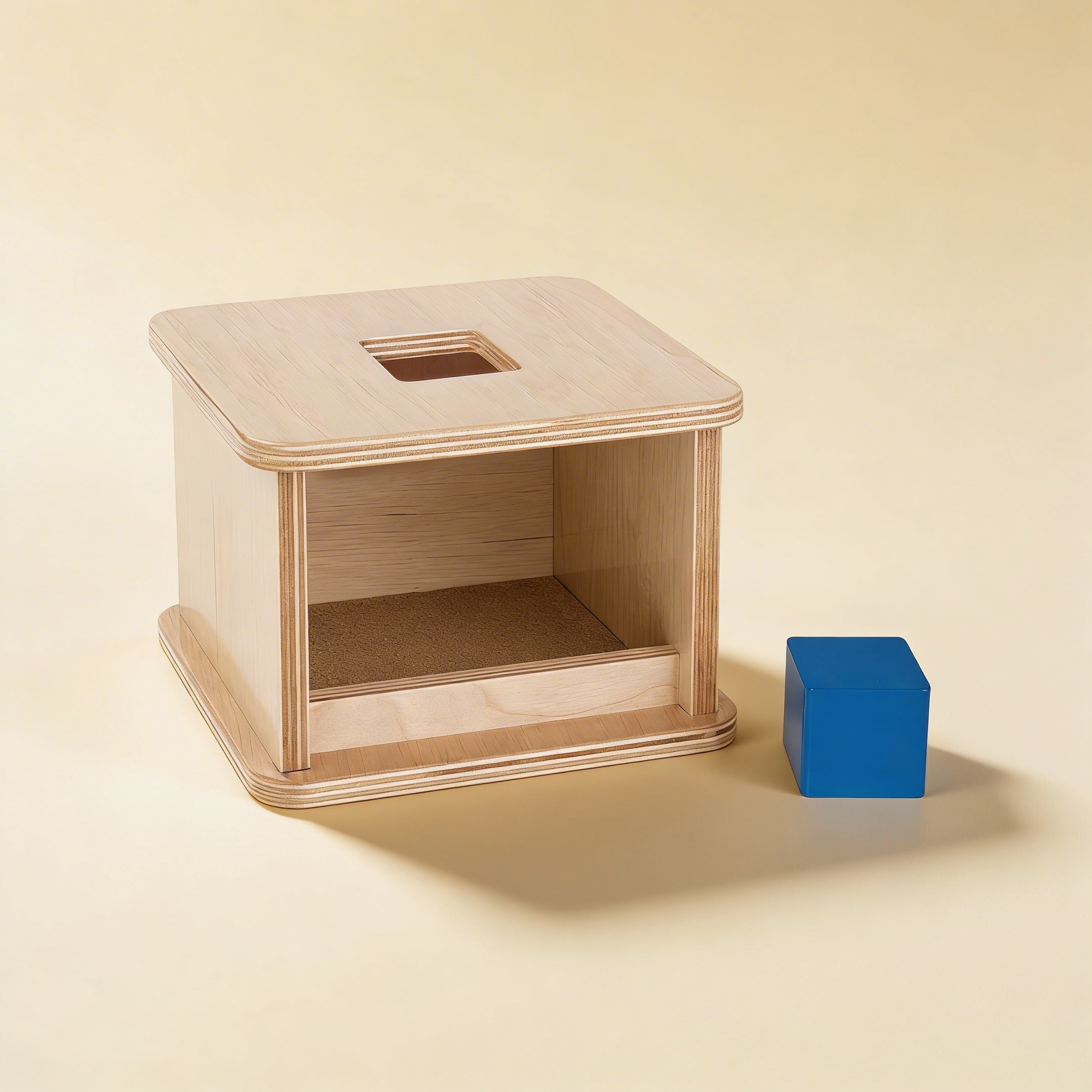 Diese Imbucare-Box mit Würfel führt Kleinkinder durch zielgerichtete Handbewegungen an die Objektpermanenz heran. Die präzise dimensionierte quadratische Öffnung leitet die sich entwickelnde Hand-Auge-Koordination des Kindes, während es den blauen Holzwürfel greift und loslässt. Das offene Frontfach bietet sofortige visuelle Rückmeldung, wenn der Würfel verschwindet und wieder erscheint.