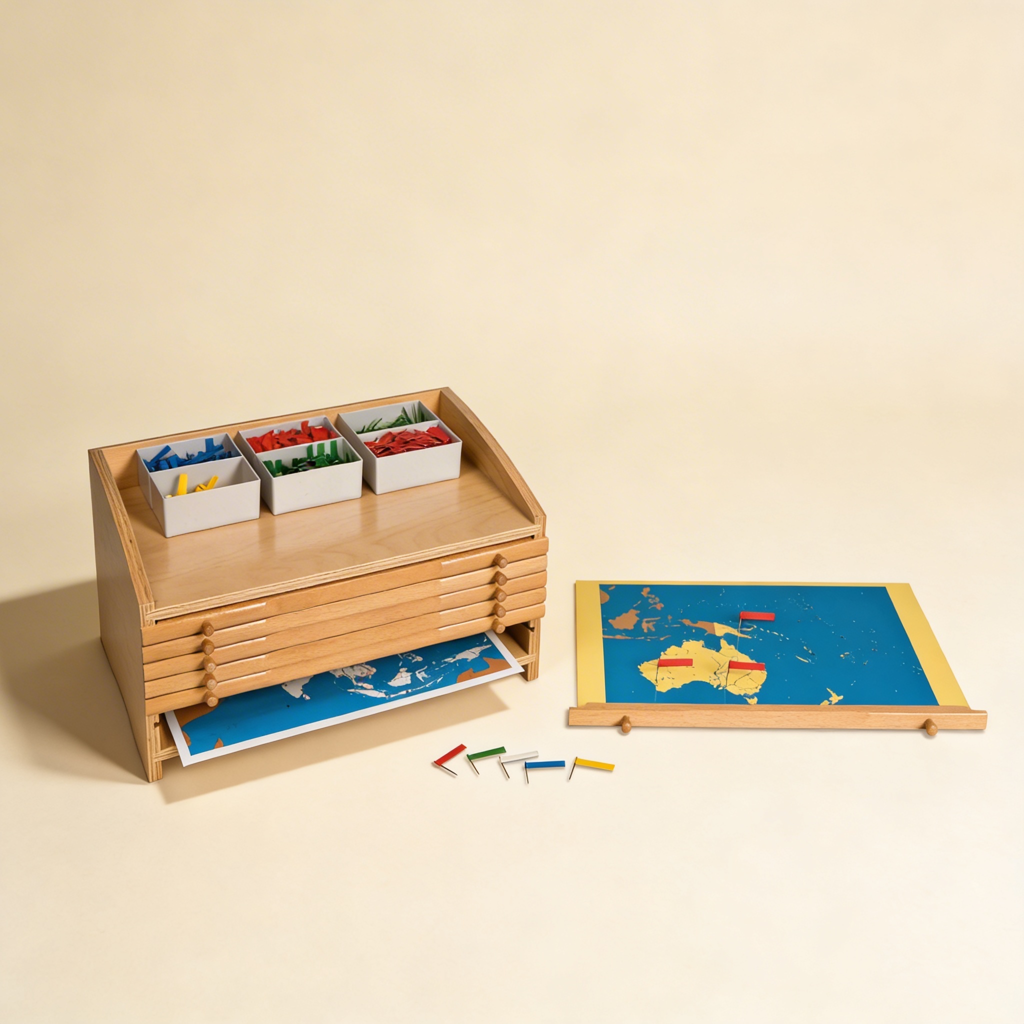 Beginnen Sie damit, den Schrank selbst als besonderen Ort für Geographie-Materialien zu präsentieren und zeigen Sie Ihrem Kind, wie jede Schublade ihren vorgesehenen Inhalt hat. Beginnen Sie mit den Kontinentpuzzlekarten, angefangen mit Ihrem Heimatkontinent, um Relevanz und Verbindung herzustellen. Demonstrieren Sie den vollständigen Zyklus: vorsichtiges Herausnehmen der Materialien, zweckvolle Verwendung und Rückgabe an ihre exakten Standorte. Die Organisation des Schranks unterstützt natürlich die Montessori-Sequenz - von konkret (Puzzlekarten) zu abstrakt (Flaggen, Nomenklatur). Lassen Sie Ihr Kind einen Kontinent gründlich erkunden, bevor Sie andere einführen, und betonen Sie dabei immer die Sorgfalt und den Respekt für Materialien, die der schöne Schrank repräsentiert.