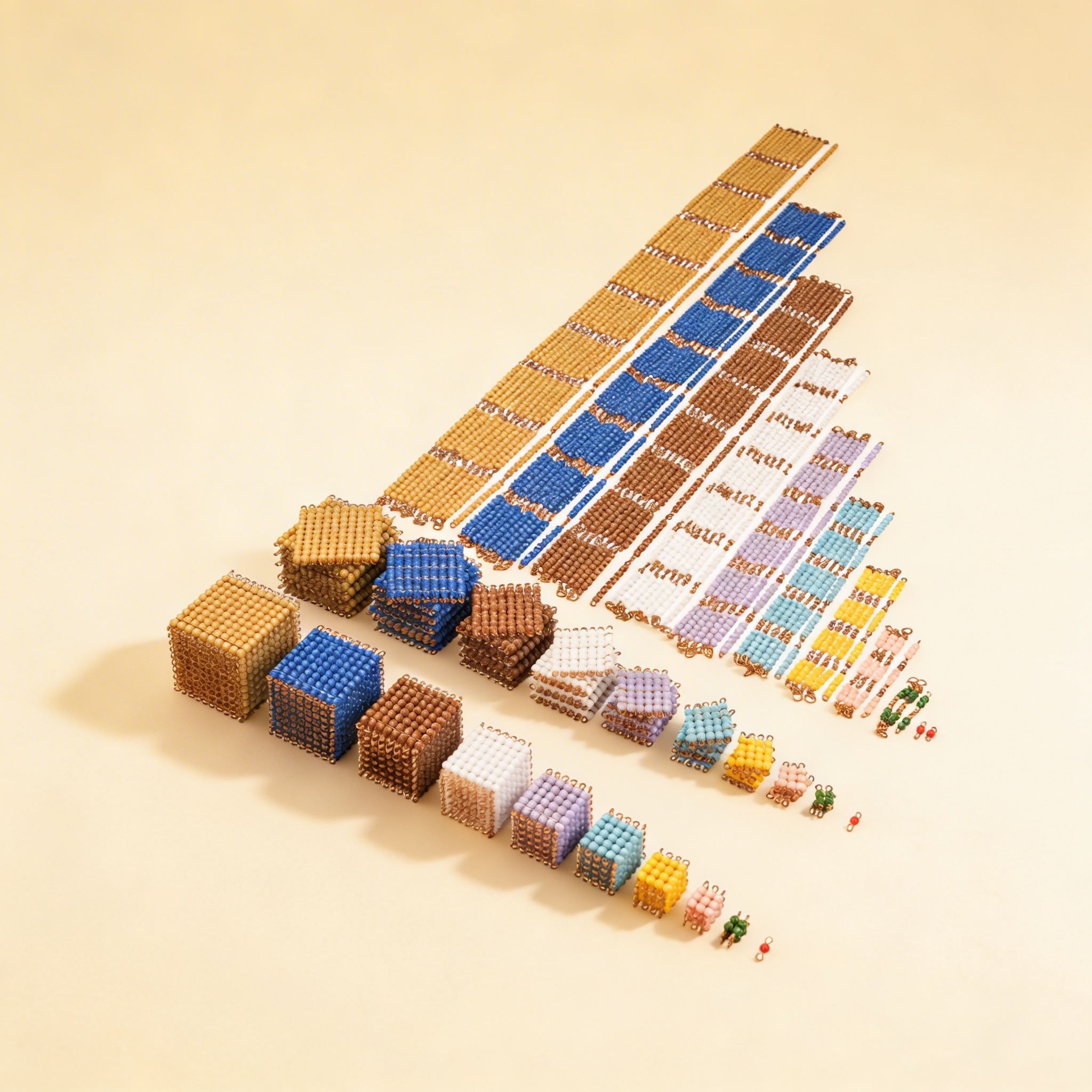 Das Individual Beads Nylon-Material verkörpert Montessoris fundamentales Prinzip, dass abstrakte mathematische Konzepte zuerst durch konkrete Manipulation erfahren werden müssen. Dieses wunderschöne Goldperlen-System verwandelt die unsichtbare Dezimalhierarchie in greifbare Realität und ermöglicht es Kindern, mathematische Beziehungen buchstäblich in ihren Händen zu halten. Die präzise hierarchische Progression des Materials—von einzelnen Einheitsperlen bis zu Tausenderwürfeln—spiegelt die natürliche Entwicklung des Kindes vom konkreten zum abstrakten Denken wider. Jeder Mengenunterschied von zehn wird nicht nur erklärt, sondern körperlich durch Größen-, Gewichts- und Volumenveränderungen erfahren. Die Nylonkonstruktion gewährleistet Haltbarkeit bei Beibehaltung der wesentlichen sensorischen Eigenschaften, die mathematische Konzepte für junge Köpfe zugänglich machen. Durch gleichzeitiges Ansprechen mehrerer Sinne baut dieses Material echtes mathematisches Verständnis statt bloße Auswendiglernen auf, schafft neuronale Verbindungen, die lebenslanges mathematisches Denken unterstützen und legt das Fundament für alle zukünftigen Rechenoperationen.