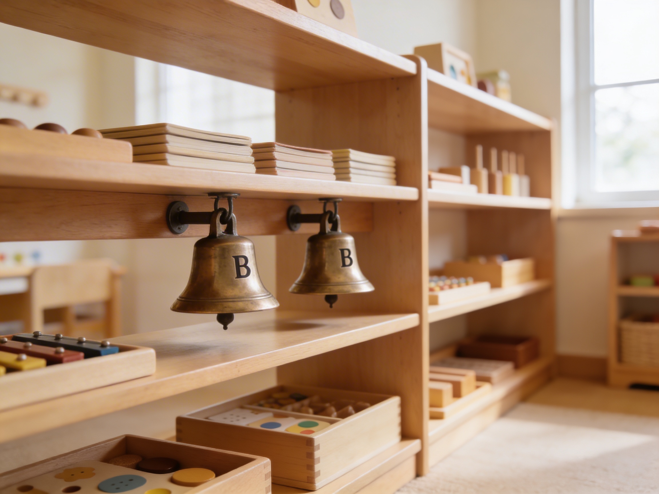 The 2 Bells Mounted B Flat isolates a single pitch to refine auditory discrimination in young children. These polished metal bells on wooden handles present the same tone twice, allowing children to discover the concept of 'same' through sound alone. Maria Montessori recognized that pitch discrimination develops most effectively when children can manipulate physical objects that produce consistent, clear tones. The B Flat bells' mounted design ensures precise sound production each time the child strikes them. By working with paired bells of identical pitch, children build the foundational listening skills necessary for later musical work. The metal domes create pure, resonant tones that capture attention while the wooden handles provide appropriate grip for small hands. This specific pitch isolation prepares children for the more complex work of matching different pitches in the full bell set.