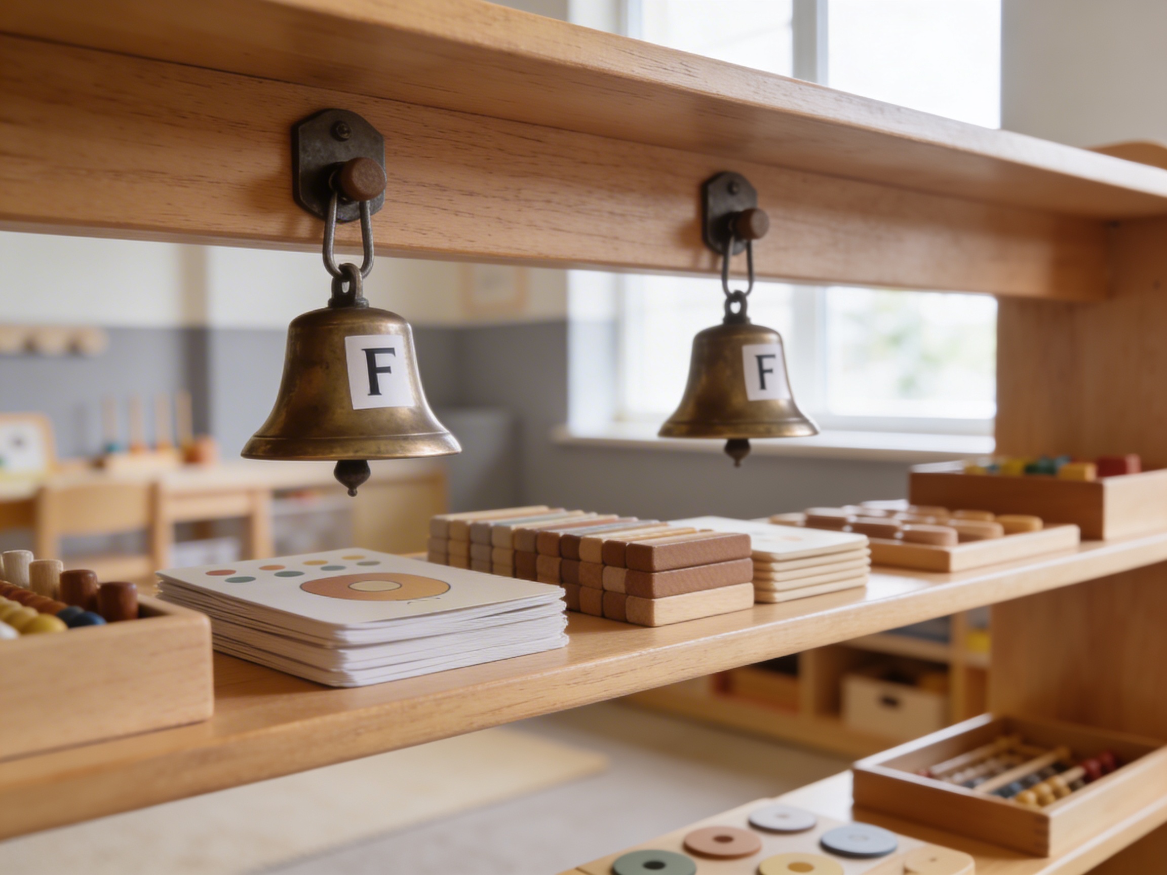 The bells are typically introduced around age 3.5-4, after children have worked with other sensorial materials like the sound cylinders. They should have developed careful movement control and the ability to concentrate on subtle differences in sound before beginning work with the bells.