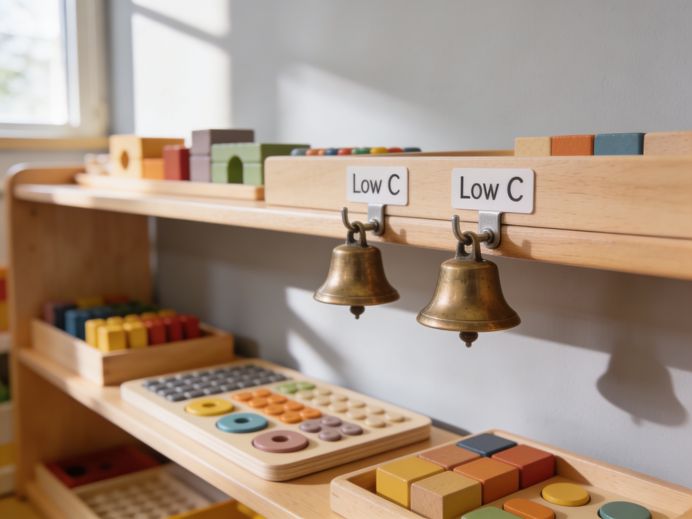 The 2 Bells Mounted: Low C represent Montessori's understanding that musical pitch discrimination develops through isolated sensory experiences. These precision-tuned Low C bells provide the exact same pitch in duplicate, allowing children to discover the concept of 'same' through their own auditory exploration. The polished metal bells on wooden handles offer a specific frequency that remains consistent with each strike, enabling the child to build auditory memory through repetition. In Montessori education, the paired Low C bells serve as the entry point to pitch discrimination work, as children must first understand matching identical sounds before progressing to distinguishing different pitches. The clear, sustained tone of these Low C bells gives the child's ear time to fully absorb the pitch quality. Through working with these identical bells, children develop the foundational listening skills that prepare them for more complex musical concepts, including the ability to order bells by pitch and eventually correlate pitch to musical notation.