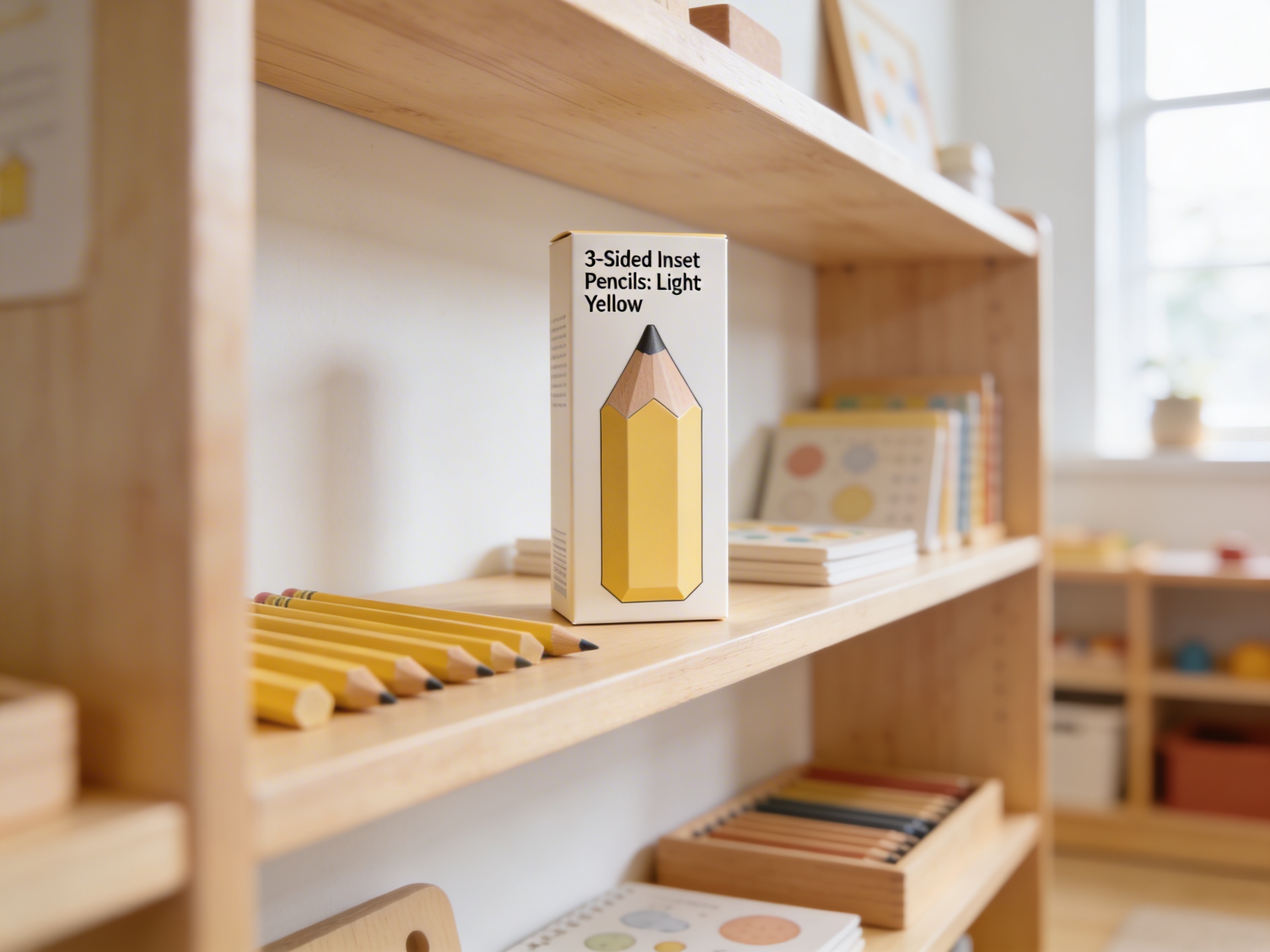 The 3-sided inset pencil addresses a fundamental challenge in early writing development: establishing proper grip before habit formation begins. These triangular pencils create physical boundaries that prevent common grip errors like thumb-wrapping or fist-holding, which can impede writing fluency later. The three flat surfaces of each light yellow pencil correspond directly to where thumb, index, and middle fingers should rest, creating a self-correcting tool that eliminates constant adult intervention. In Montessori environments, writing preparation begins long before letter formation, and these ergonomic pencils bridge the gap between preliminary hand strengthening activities and actual writing work. The specific triangular shape reduces hand fatigue during extended drawing sessions, allowing children to focus on creative expression rather than grip discomfort. Light yellow coloring serves dual purposes: providing high visibility against white paper for visual tracking while introducing color vocabulary naturally through daily use.