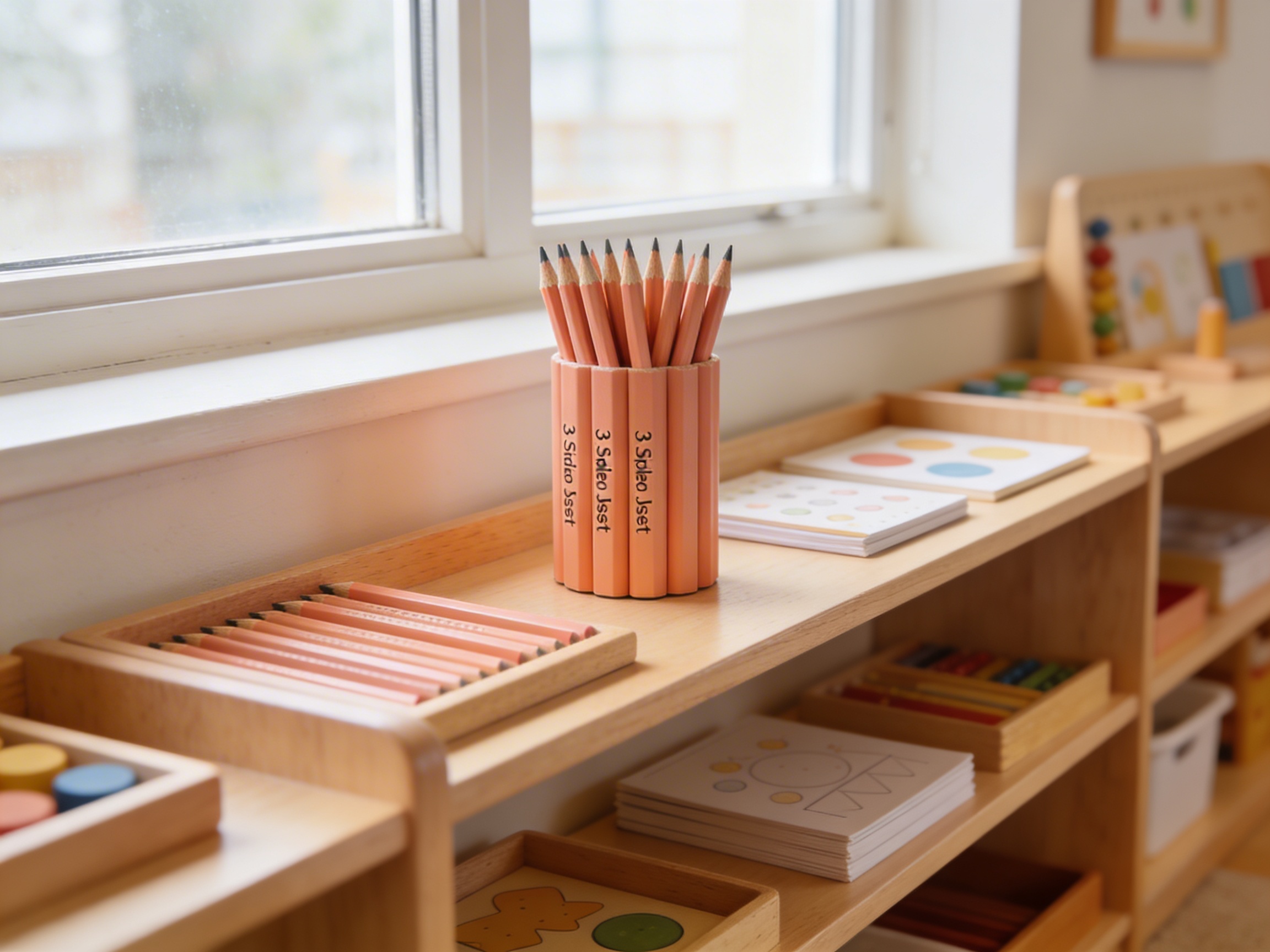 The 3-Sided Inset Pencil addresses the fundamental need for refined hand control that emerges as children transition from grasping movements to precise finger coordination. This triangular design eliminates the struggle of round pencils rolling away while directly supporting the development of the pincer grasp essential for writing. The peach-colored core offers a gentle, warm tone that encourages artistic expression without overwhelming the child's visual field. Unlike standard pencils that require constant correction, these ergonomic tools allow the child's fingers to naturally find their optimal position, freeing mental energy for creative work rather than grip adjustment. The triangular shape serves as a concrete guide, teaching through form rather than verbal instruction—a cornerstone of Montessori practice. This specialized pencil bridges the gap between the metal insets work and actual writing, providing the intermediate tool needed when small hands are ready for mark-making but still developing muscular control.