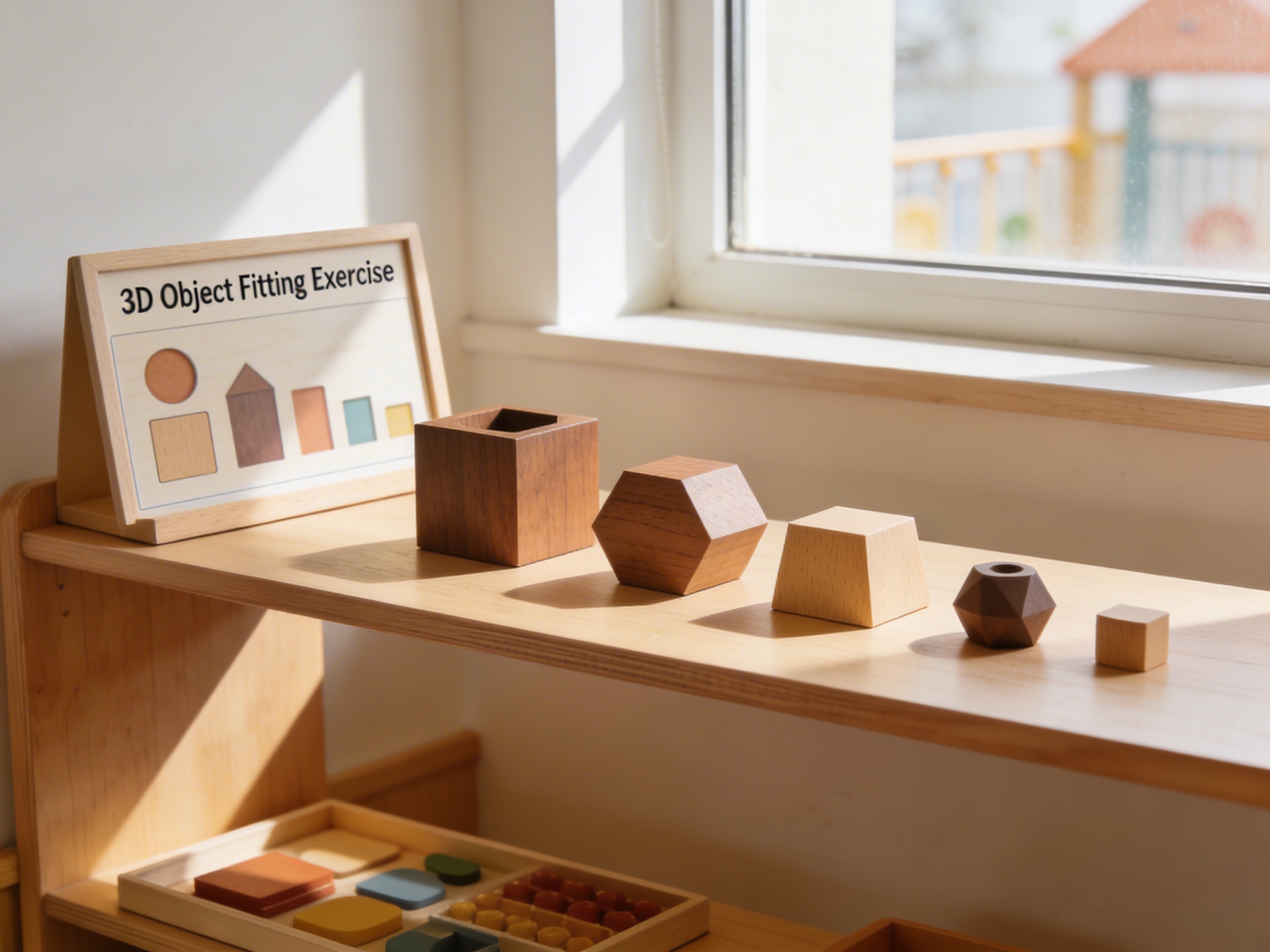 The 3D Object Fitting Exercise addresses the toddler's innate need to explore three-dimensional forms through purposeful hand movements. Between ages 0-3, children develop spatial intelligence by physically manipulating the cube, cylinder, ovoid, and sphere, discovering how each shape relates to its matching base. The natural beechwood tray with dual handles respects the child's drive for independence, allowing them to carry their chosen work to any workspace. Each geometric form in the 3D Object Fitting Exercise provides distinct tactile feedback—the cube's sharp edges, the sphere's continuous curve, the cylinder's rolling motion, and the ovoid's unique asymmetry. This material bridges the gap between the infant's grasping reflex and the preschooler's refined pencil grip, as fitting each shape requires different hand positions and pressures. The 3D Object Fitting Exercise isolates the concept of form, preparing the mathematical mind to later recognize these shapes in their environment and abstract geometric study.