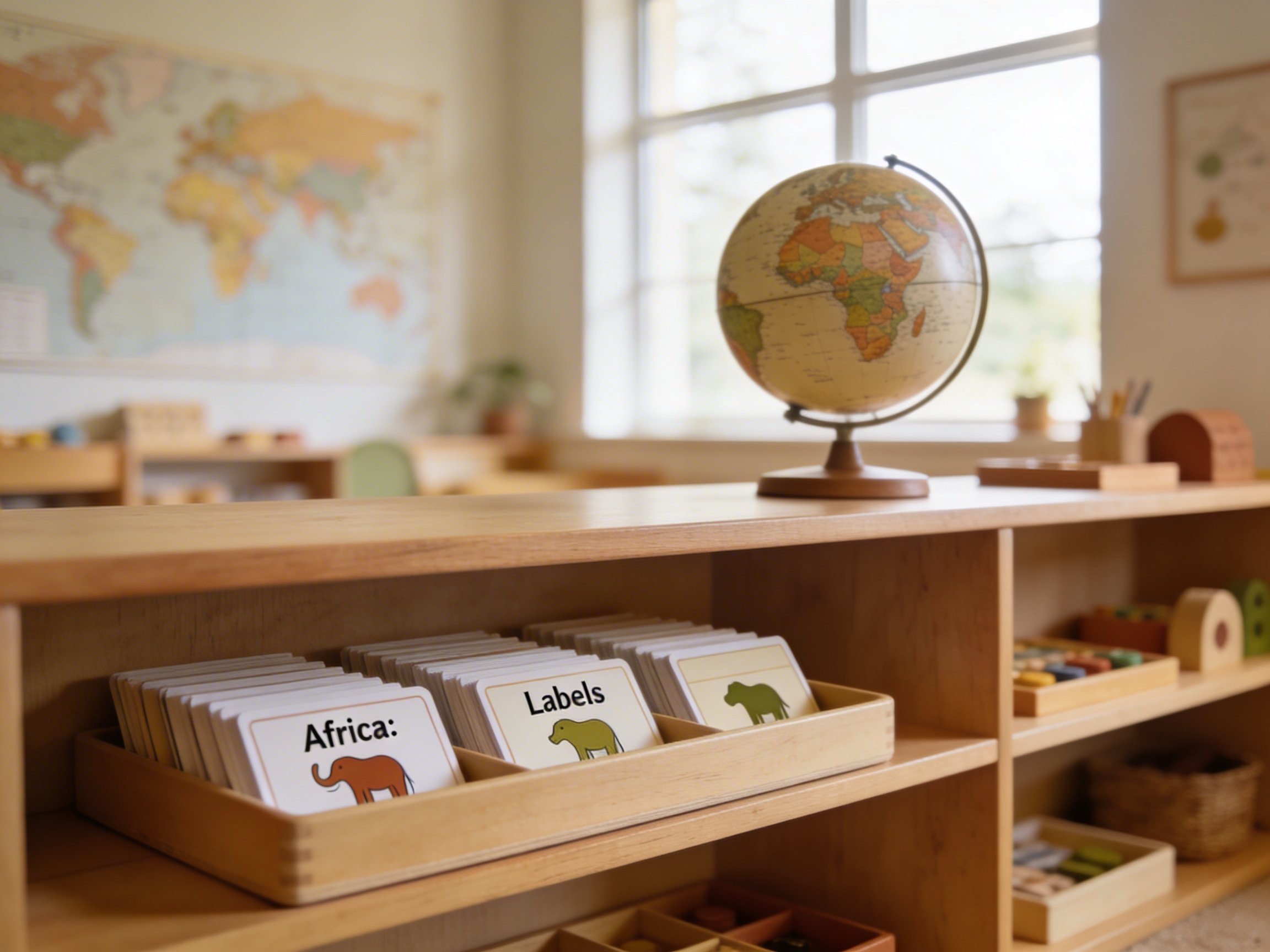 The Africa Labels serve as a bridge between concrete geographical exploration and abstract language work in the Montessori classroom. These paper labels transform the sensorial experience of the Africa puzzle map into meaningful nomenclature work, allowing children to connect physical boundaries with written country names. The transparent acrylic container creates an organized system where each label remains visible and accessible, encouraging independent selection and verification. Through matching these labels to puzzle pieces, children develop their reading skills within a geographical context, making abstract political boundaries tangible through repeated manipulation. The Africa Labels respect the child's need for order by providing a specific place for each country name, while the clear container allows visual inventory before beginning work. This material addresses the developmental need for classification and nomenclature that emerges around age four, when children seek to name and categorize their expanding world knowledge.
