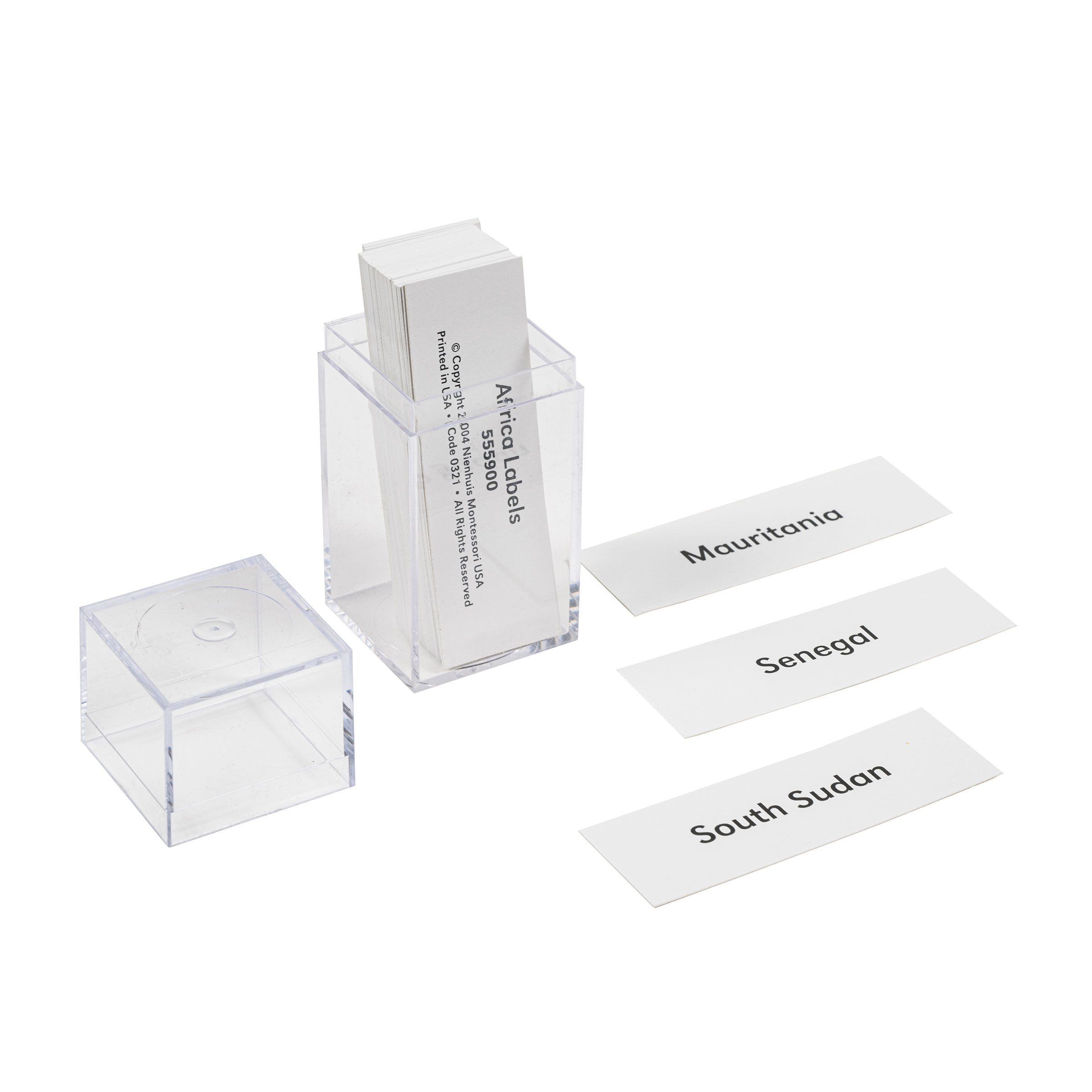These Africa Labels support the Montessori geography curriculum by providing clear, readable country names for the Africa puzzle map. The durable paper labels are housed in a transparent acrylic container that allows children to easily see and select the appropriate labels while working independently with geography materials.