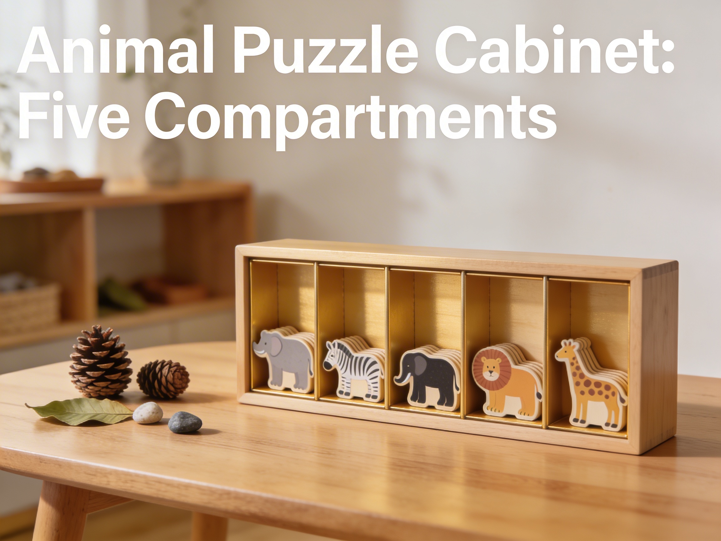 The Animal Puzzle Cabinet addresses the three-to-six-year-old child's intense need for order and classification in their environment. Its five separate compartments create distinct spaces for each zoology puzzle, allowing children to internalize categories of the animal kingdom through repeated, organized work. The cabinet's slanted display surface positions puzzles at the precise angle where small hands can manipulate pieces without strain, honoring the child's physical development. When a child slides open a compartment to select their chosen puzzle, they experience the satisfaction of accessing materials independently—a cornerstone of developing will and decision-making. The Animal Puzzle Cabinet transforms what could be scattered puzzle work into a structured exploration of zoology, where each puzzle piece finds its home within its designated compartment, mirroring how each animal belongs to its specific classification in nature.
