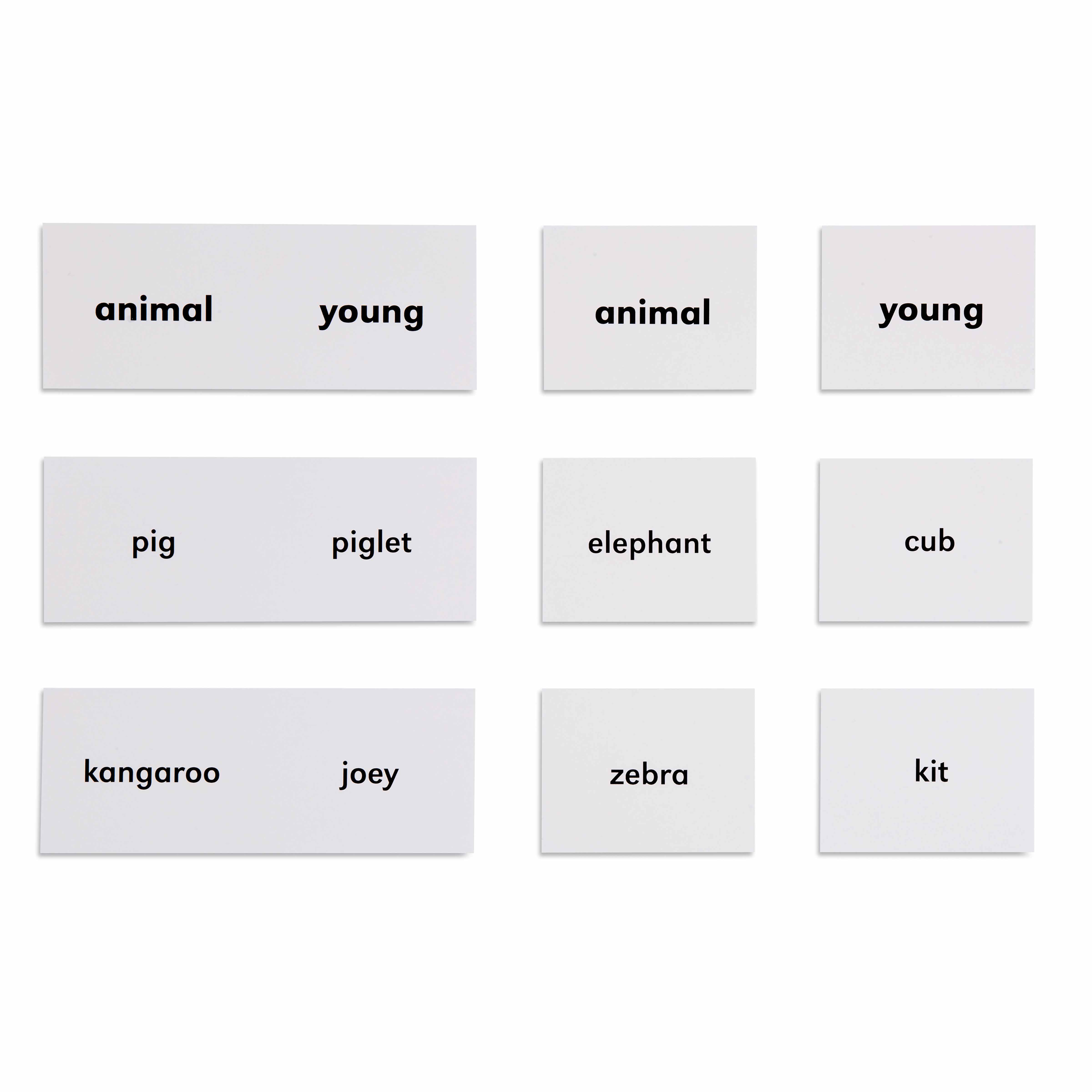 The Animals and Their Young matching cards address the child's innate drive to classify and name their world during the sensitive period for language. These laminated cards present precise vocabulary pairs—'horse' and 'foal,' 'duck' and 'duckling'—that satisfy the child's need for accurate nomenclature. In Montessori biology, we recognize that children between three and six years possess an extraordinary capacity to absorb specialized vocabulary when presented through concrete, visual materials. The matching format of these animal cards allows children to create their own connections between parent and offspring, building mental categories through hands-on manipulation. Each card's clear text label provides the exact terminology that enriches the child's spoken vocabulary while the visual matching component engages their developing powers of discrimination. This material bridges the child's love of animals with their expanding linguistic capabilities, offering real biological relationships rather than fantasy.