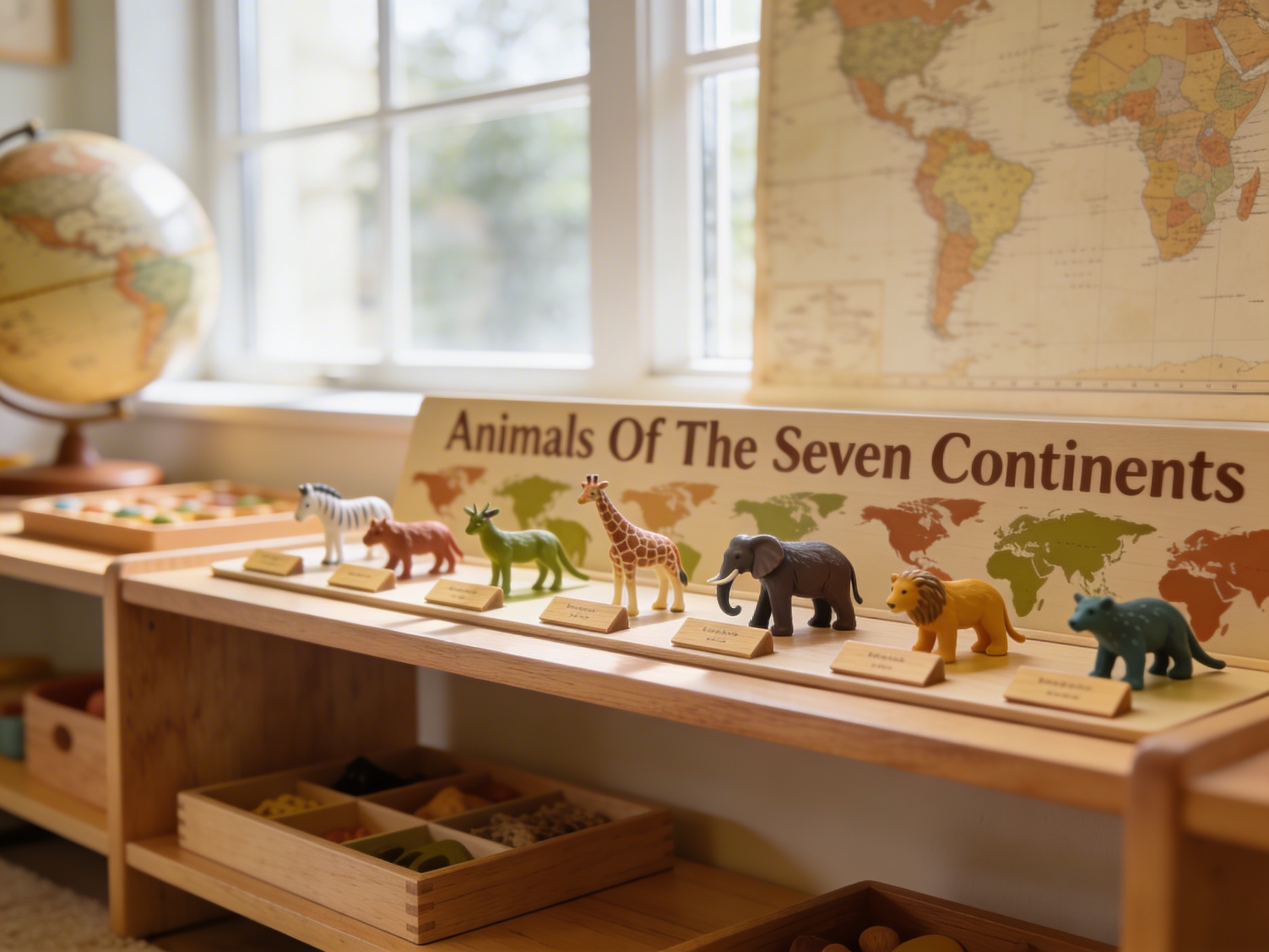 The Animals Of The Seven Continents is a category.geography Montessori material designed for children aged 3-6, crafted by Nienhuis Montessori to AMI standards.