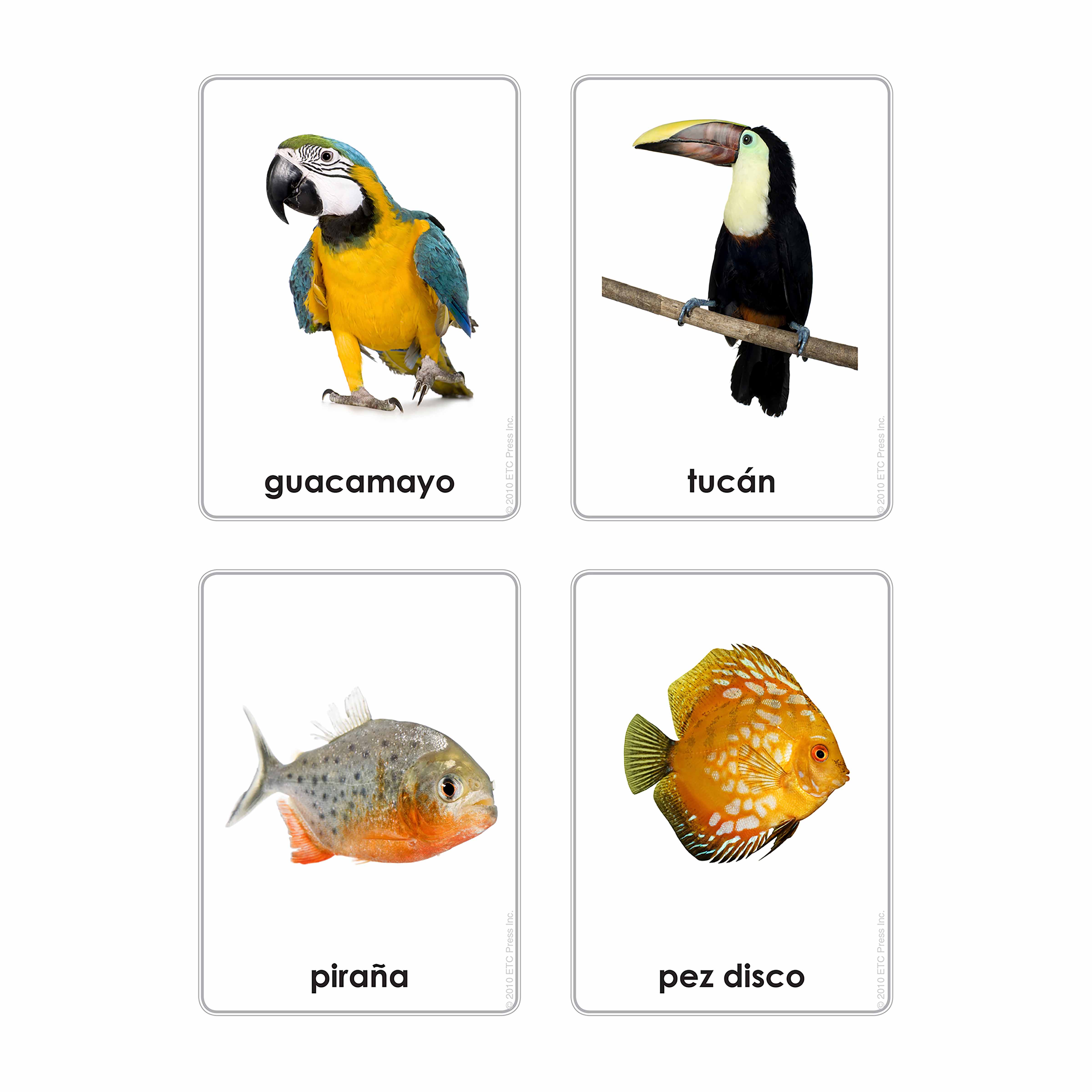 The Spanish animal names are printed directly on the laminated cards below each photograph. This integrated design ensures durability and prevents labels from being lost, while providing consistent exposure to Spanish vocabulary during geography and zoology lessons.