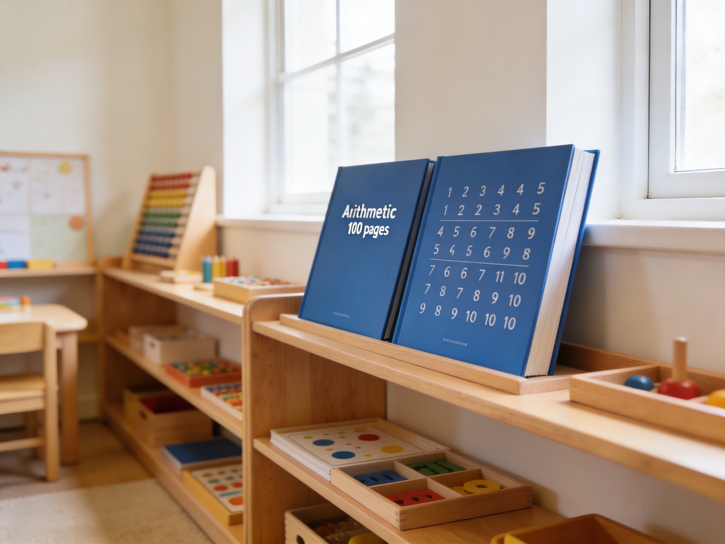 The Arithmetic Books with their blue covers and large format serve as the primary recording medium for mathematical exploration in the Montessori classroom. These 100 workbooks transform abstract numerical concepts into concrete written practice through their precisely gridded pages. The red guide lines within each book create a visual framework that helps children maintain consistent number size and proper column alignment during operations. The square format of these arithmetic books accommodates both vertical and horizontal mathematical layouts, allowing children to work with addition, subtraction, multiplication, and division in their traditional forms. The substantial quantity of 100 books ensures every child has dedicated space for repeated practice, essential for mastering arithmetic operations. The blue color coding helps children identify these as their arithmetic practice books among other classroom materials. Through daily use of these gridded workbooks, children develop the precision and organizational skills necessary for advanced mathematical work while building confidence in their computational abilities.