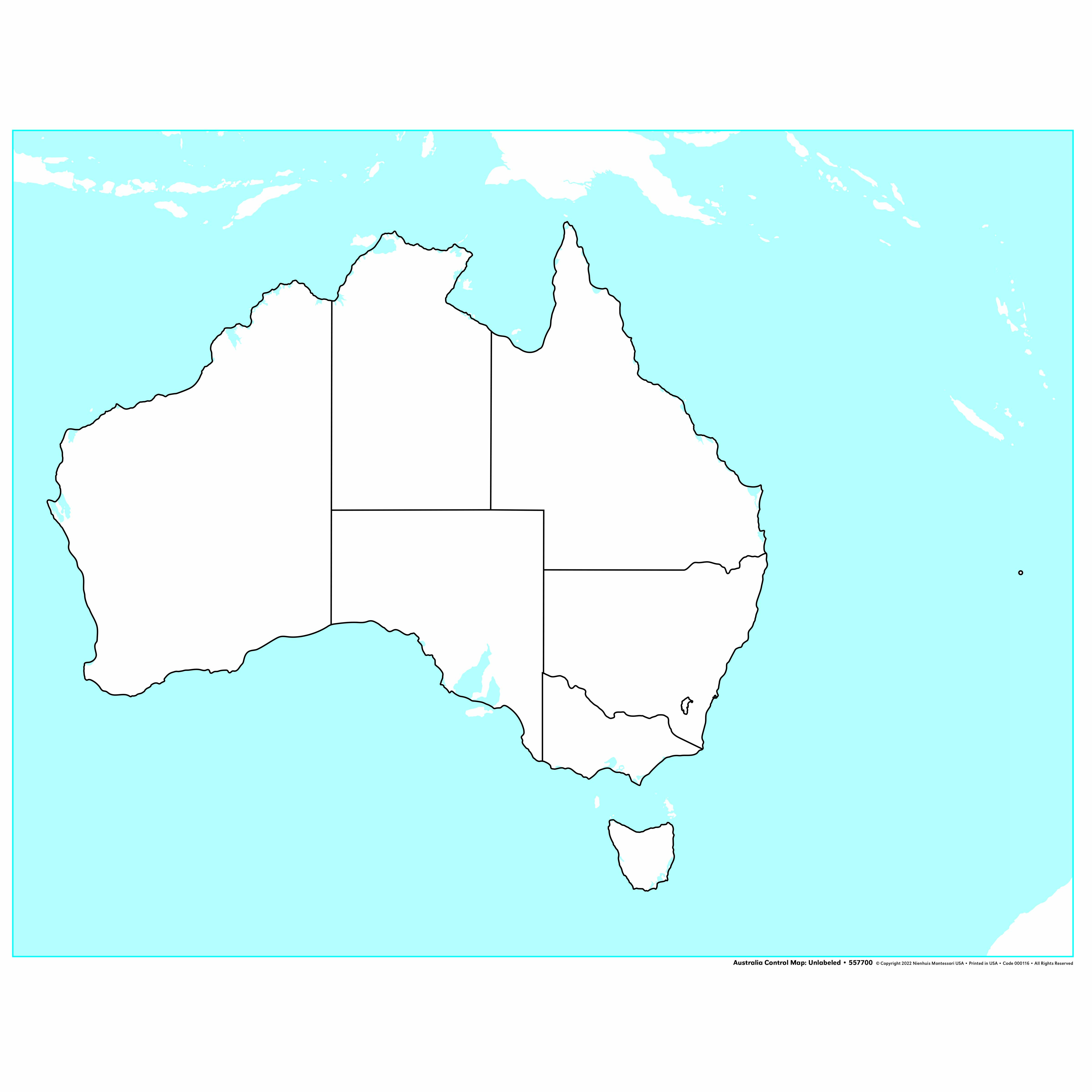 The Australia Control Map: Unlabeled is a category.geography Montessori material designed for children aged 3-6, crafted by Nienhuis Montessori to AMI standards.