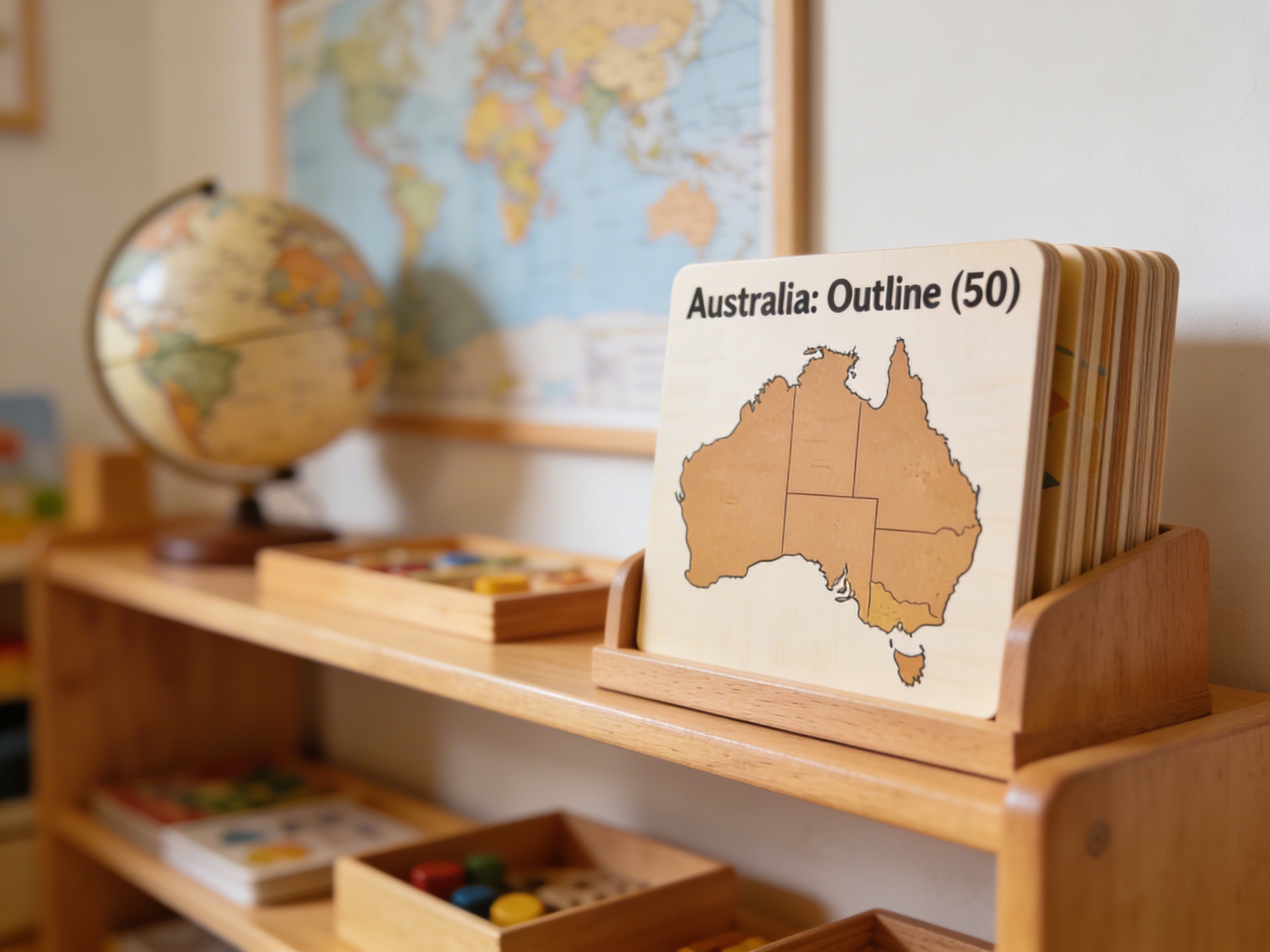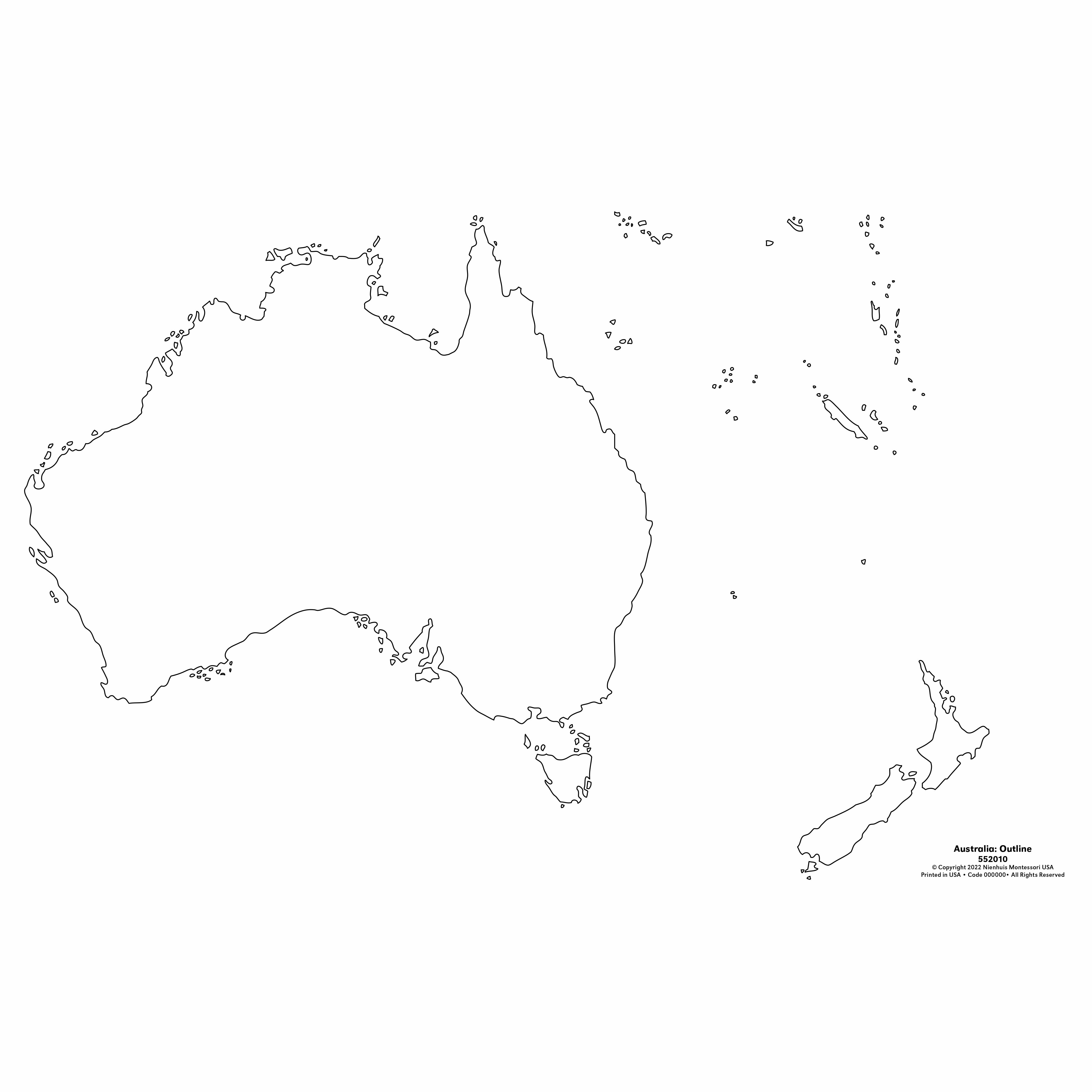 The Australia: Outline (50) is a category.geography Montessori material designed for children aged 3-6, crafted by Nienhuis Montessori to AMI standards.