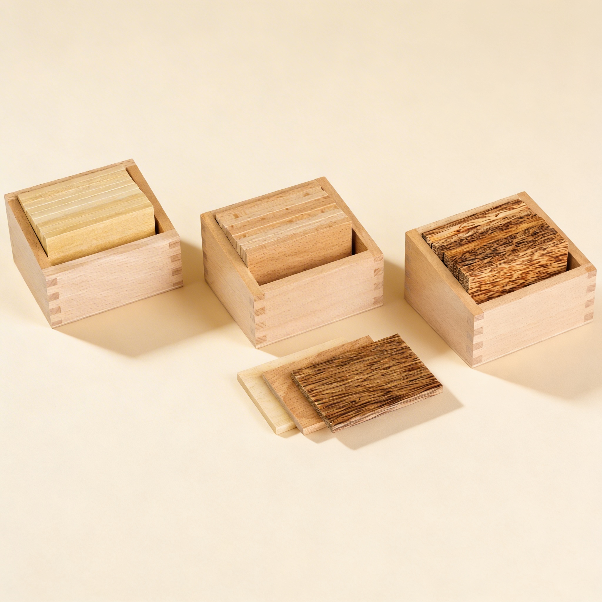 Each wood type is carefully chosen for its distinct density, creating clear weight differences that children can perceive through their muscular sense.