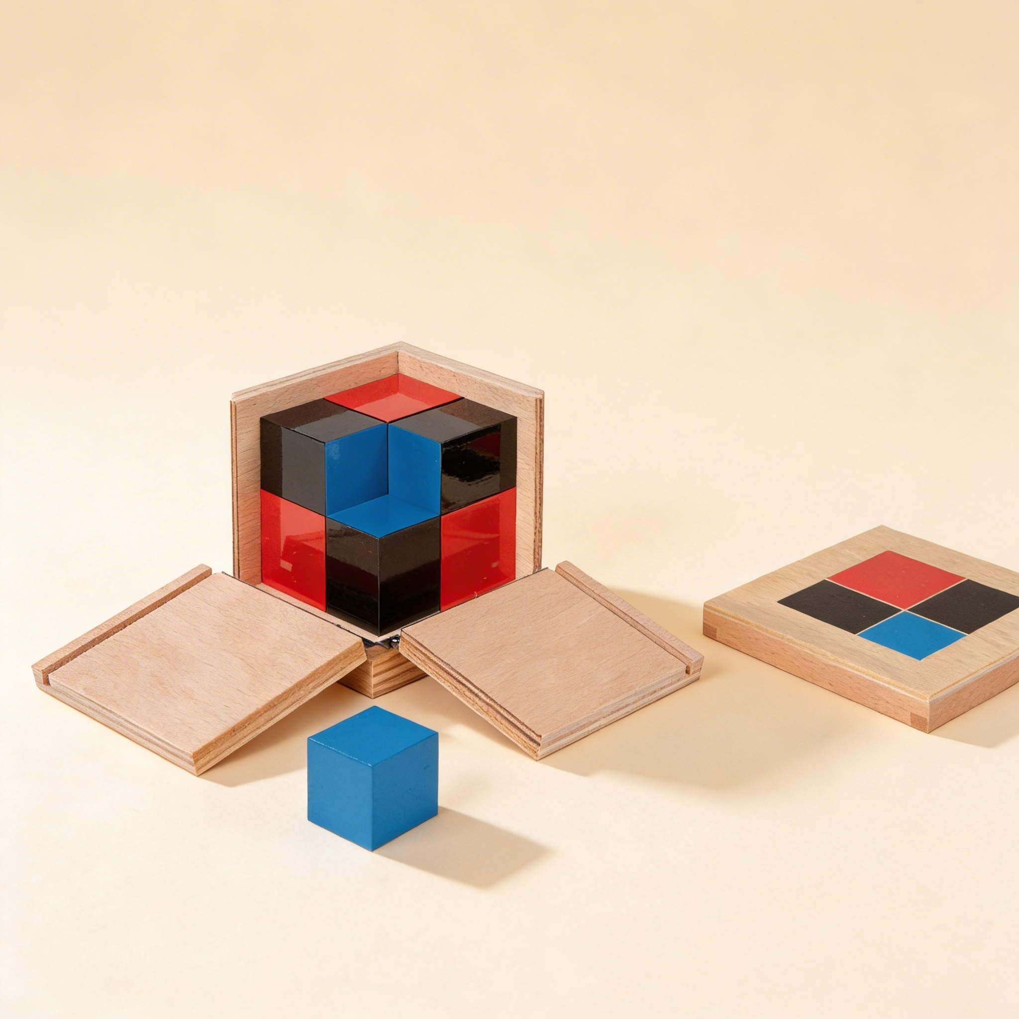 The Binomial Cube serves multiple purposes: it develops visual discrimination, fine motor skills, and spatial reasoning while indirectly preparing children for understanding algebraic concepts. Through hands-on exploration, children internalize the mathematical formula (a+b)³ without abstract instruction, building a concrete foundation for later mathematical learning.