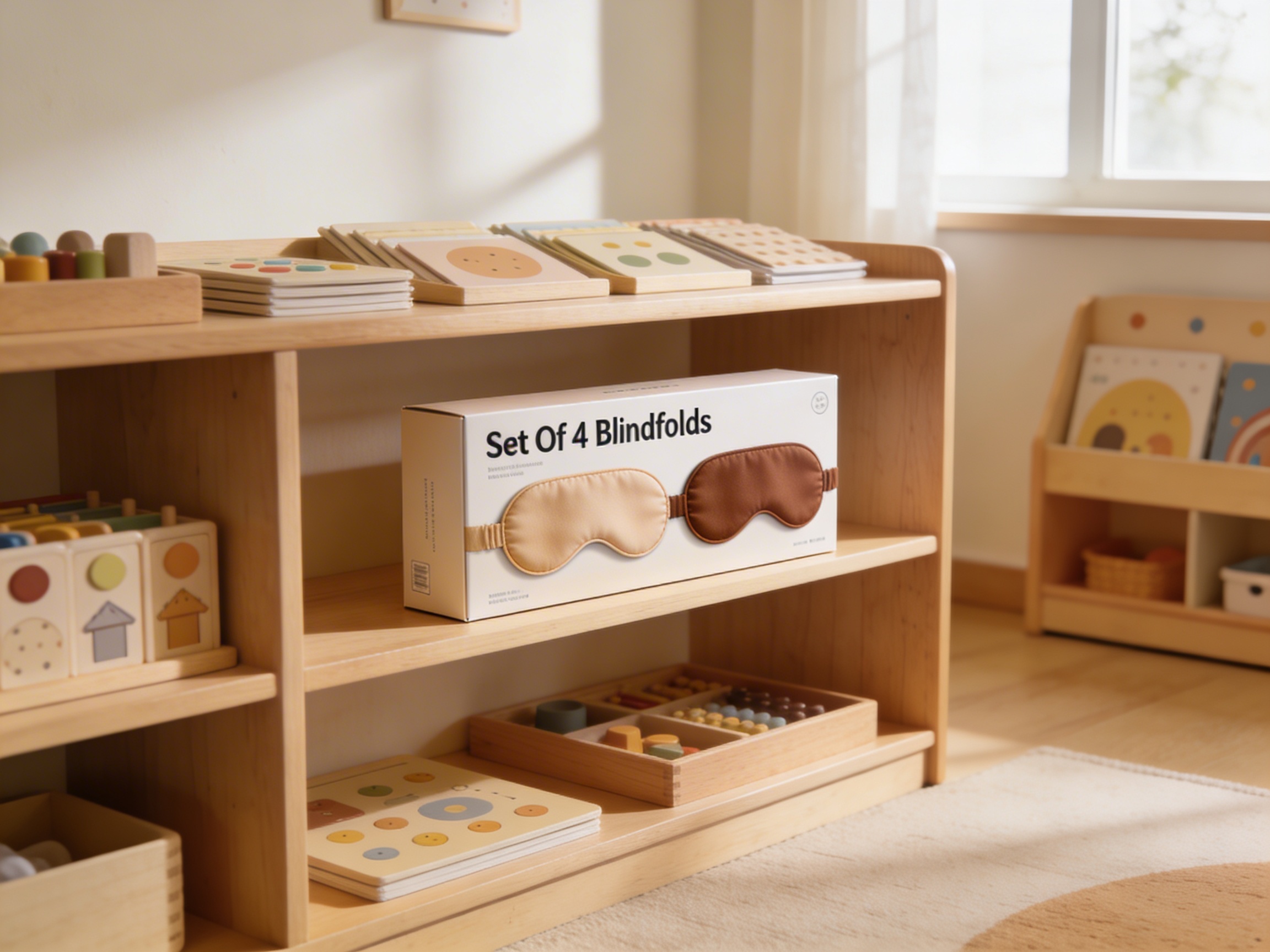 This set of four fabric blindfolds supports essential Montessori sensory isolation activities, allowing children to focus entirely on tactile, auditory, and olfactory experiences. The soft fabric construction with elastic head straps ensures comfortable wear during stereognostic exercises, mystery bag activities, and sound discrimination work, helping children develop refined sensory perception through focused attention.