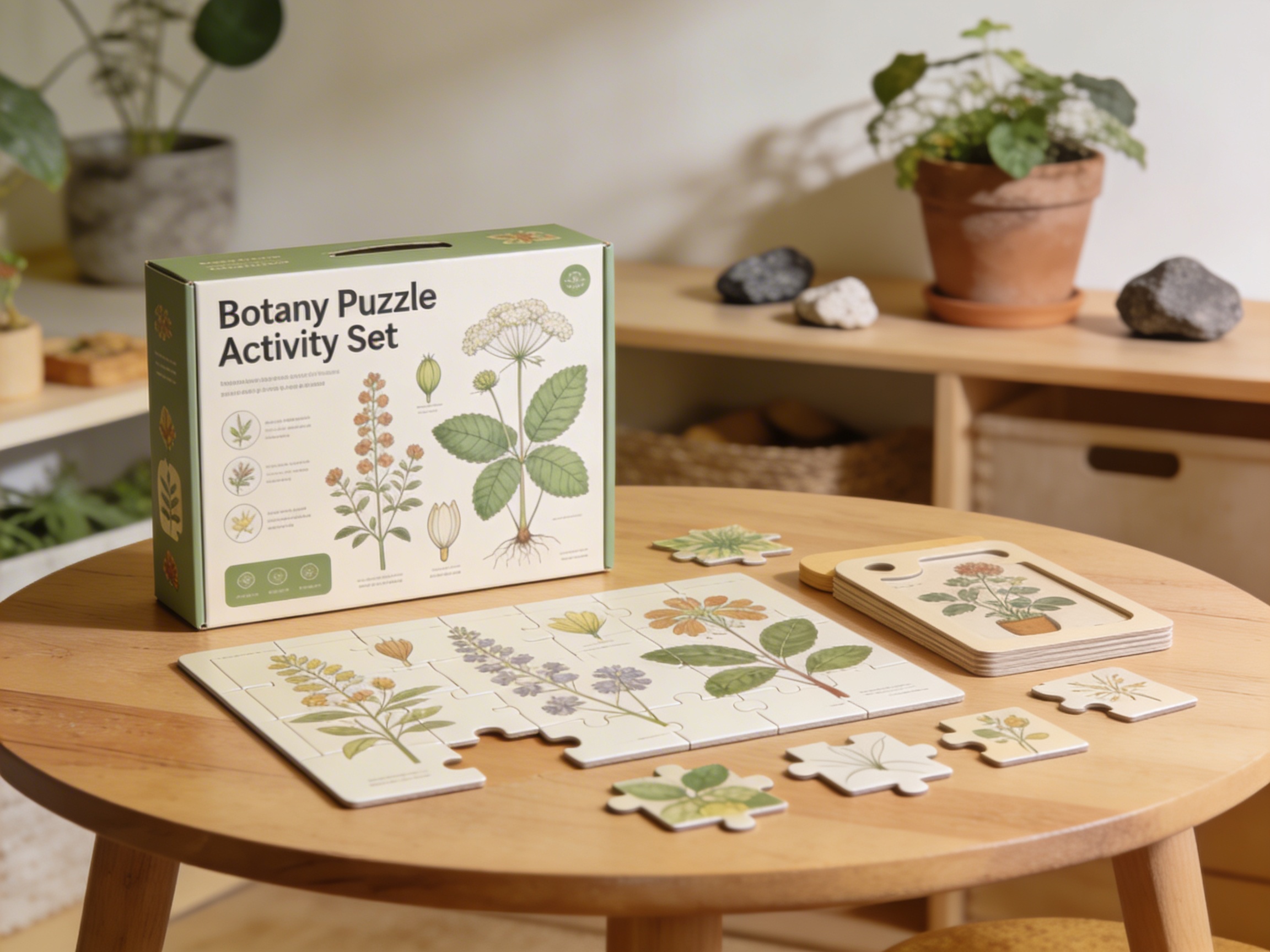 The Botany Puzzle Activity Set serves a fundamental purpose in the Montessori biology curriculum by presenting plant anatomy as concrete, manipulable pieces rather than abstract concepts. Each wooden puzzle isolates specific botanical structures—roots, stems, leaves, flowers—allowing children to physically handle and examine plant parts separately before understanding their relationships. The removable labels accompanying each puzzle piece create a three-stage learning process: first manipulating the wooden forms, then matching labels to parts, and finally using scientific vocabulary independently. This progression from concrete botanical puzzles to abstract nomenclature mirrors the child's natural cognitive development. The wooden storage box organizes multiple plant puzzles systematically, enabling children to explore different botanical specimens while maintaining classroom order. By transforming complex plant anatomy into tangible wooden pieces, the Botany Puzzle Activity Set bridges the gap between the child's sensorial exploration and scientific understanding, preparing them for more advanced botanical studies.