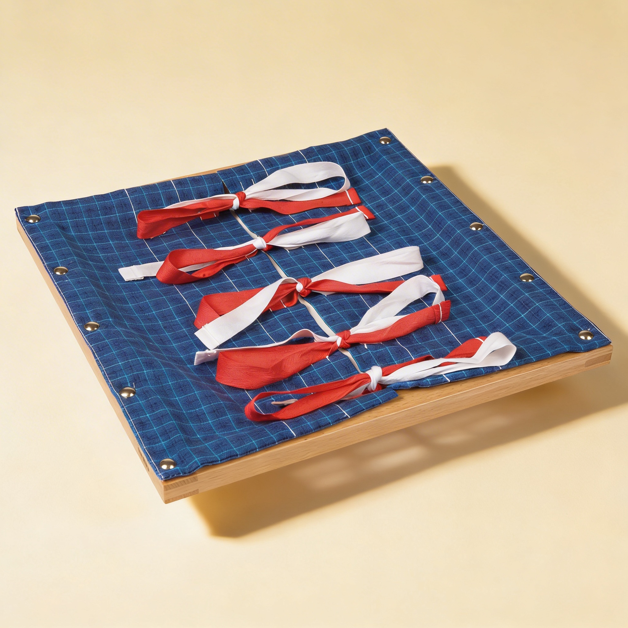 The frame isolates the bow-tying skill by providing five sets of ribbons at a comfortable working height. Children can practice the complex hand movements without the frustration of working on their own shoes, building muscle memory and confidence.