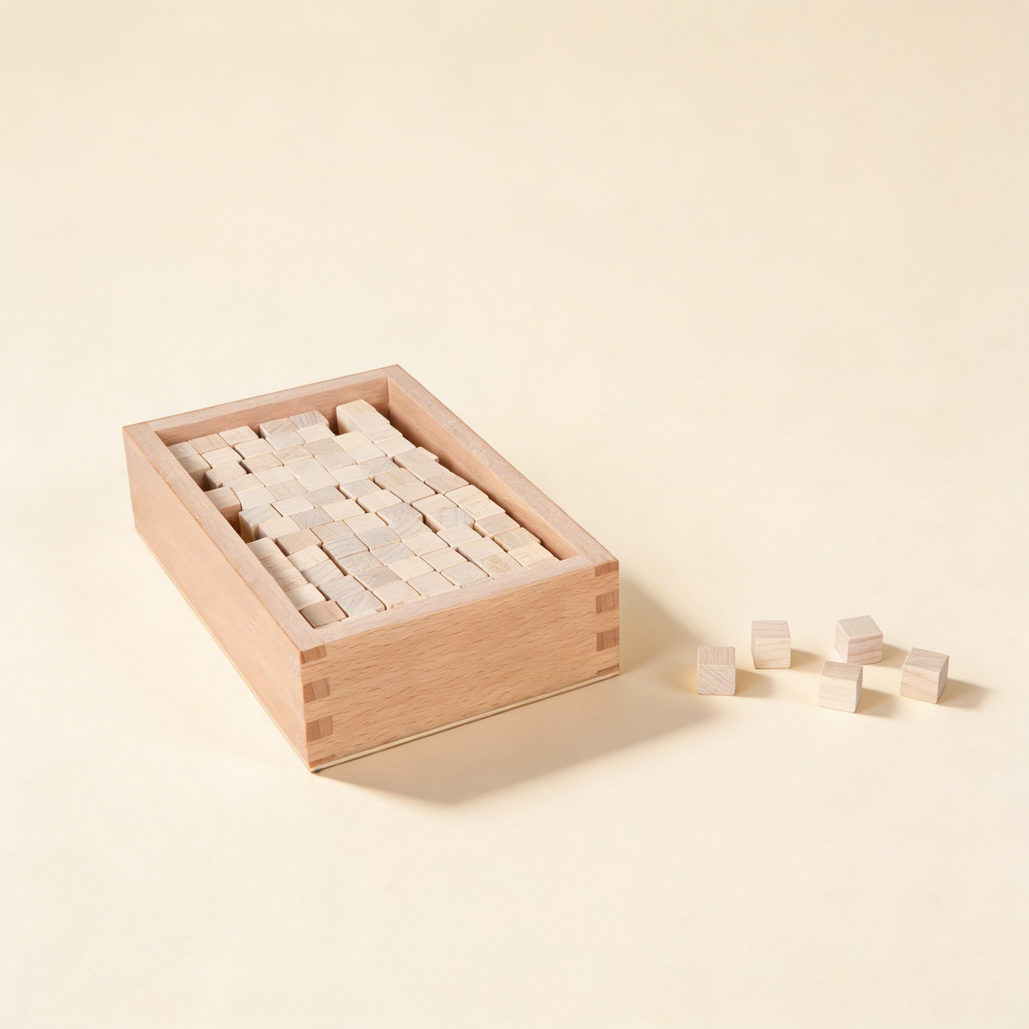 The Box With Cubes extends the mathematical precision of the Pink Tower, embodying Montessori's principle that the hand is the instrument of the mind. This auxiliary material allows children to manipulate the cubic relationships discovered through the Pink Tower in new contexts, deepening their understanding of dimension and proportion. By providing multiple identical cubes, children can create patterns, explore spatial relationships, and discover mathematical concepts through concrete manipulation. This material bridges the sensorial and mathematical areas, demonstrating Montessori's vision of integrated learning where sensory experiences lay the foundation for abstract thinking. The precision-crafted cubes offer the exactness necessary for the child's discriminating mind to perceive subtle differences and relationships.