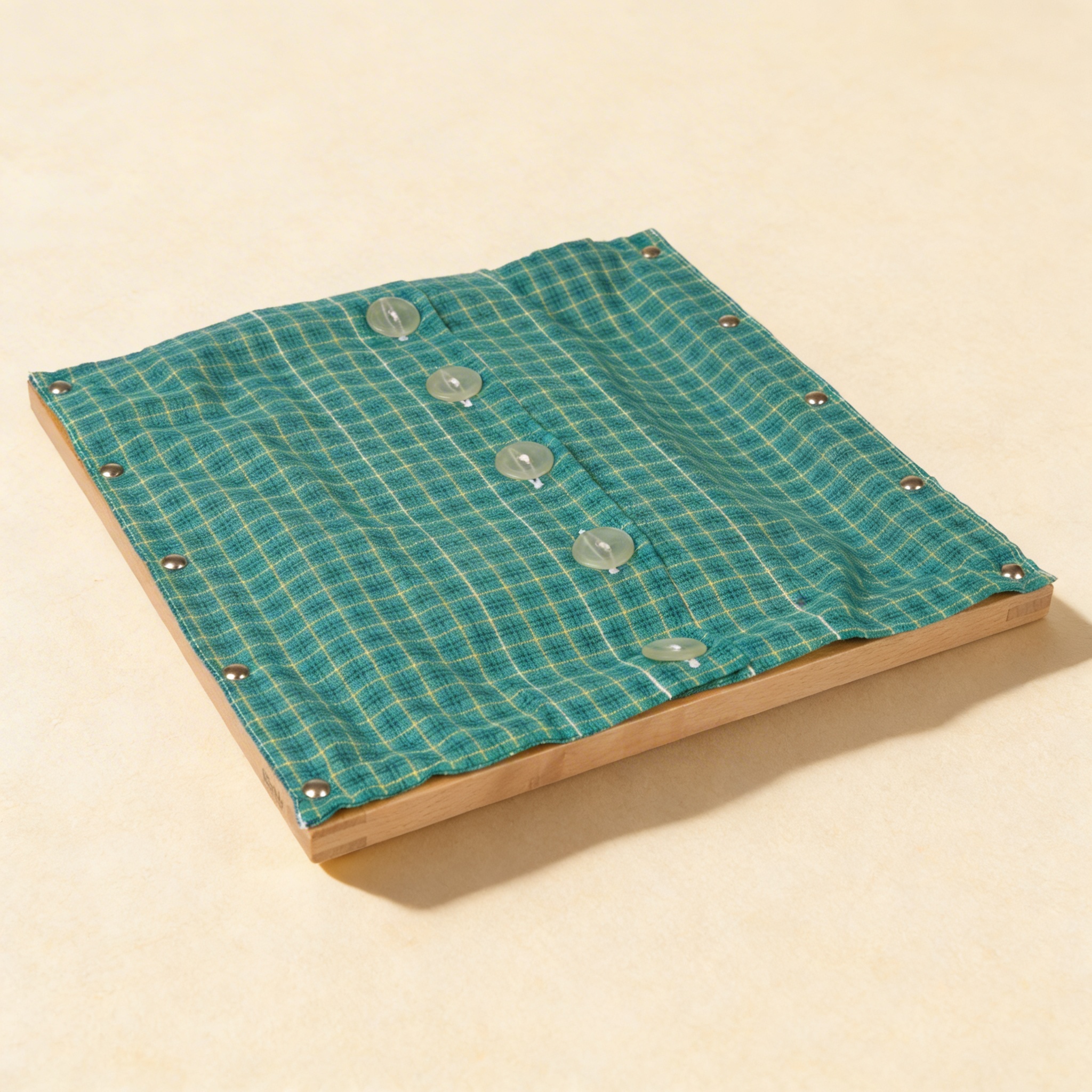 This Montessori buttoning frame features five large white buttons arranged diagonally across plaid fabric, providing an ideal introduction to the practical life skill of buttoning. The sturdy wooden frame with metal grommets ensures durability while the oversized buttons offer the perfect challenge for developing fine motor control and hand-eye coordination in young learners.