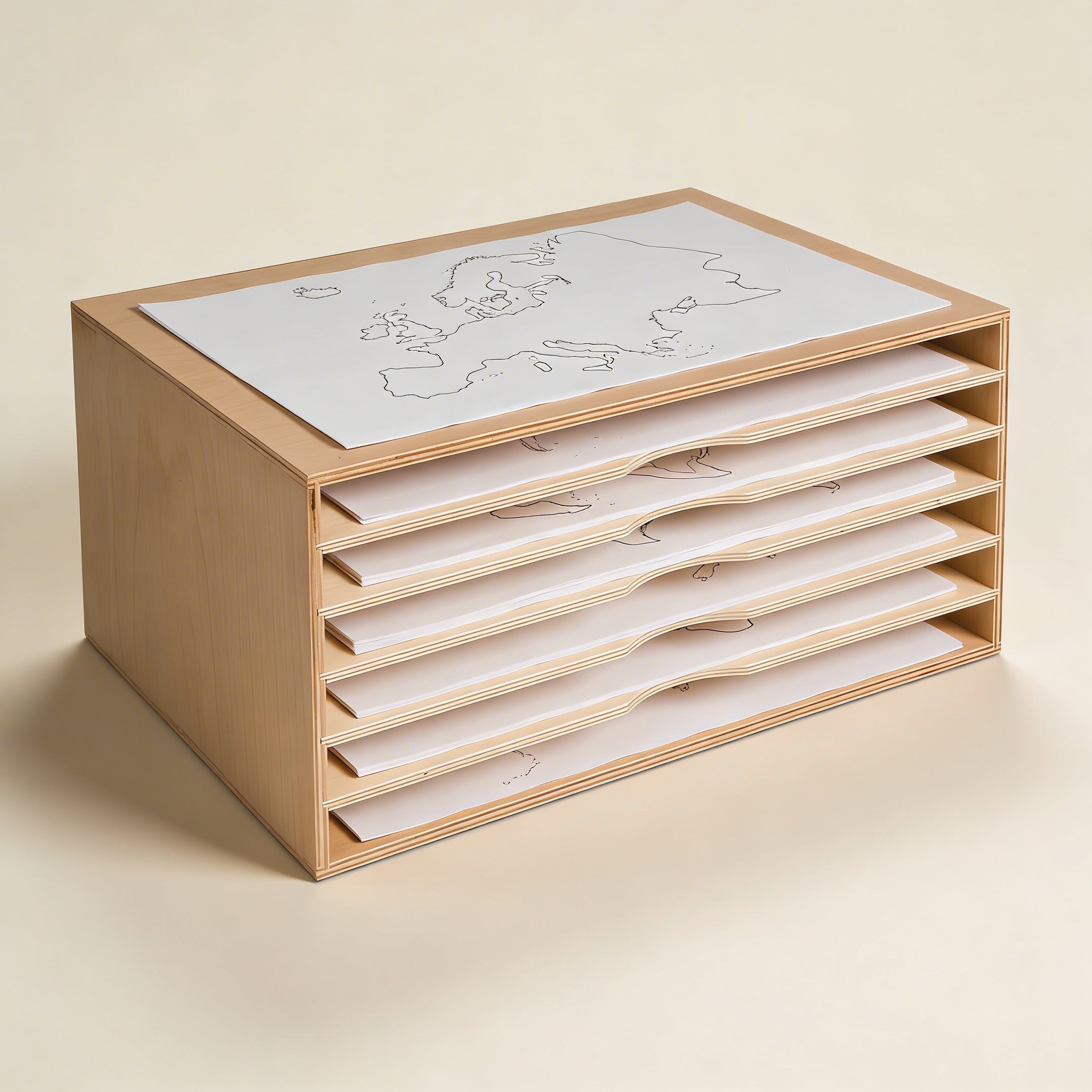 This premium wooden cabinet is crafted to AMI standards using durable, child-safe materials. The construction features smooth-sanded surfaces, rounded edges for safety, and precisely fitted compartments that accommodate standard Montessori paper maps. The natural wood finish develops a beautiful patina over time while maintaining its structural integrity through years of classroom use.