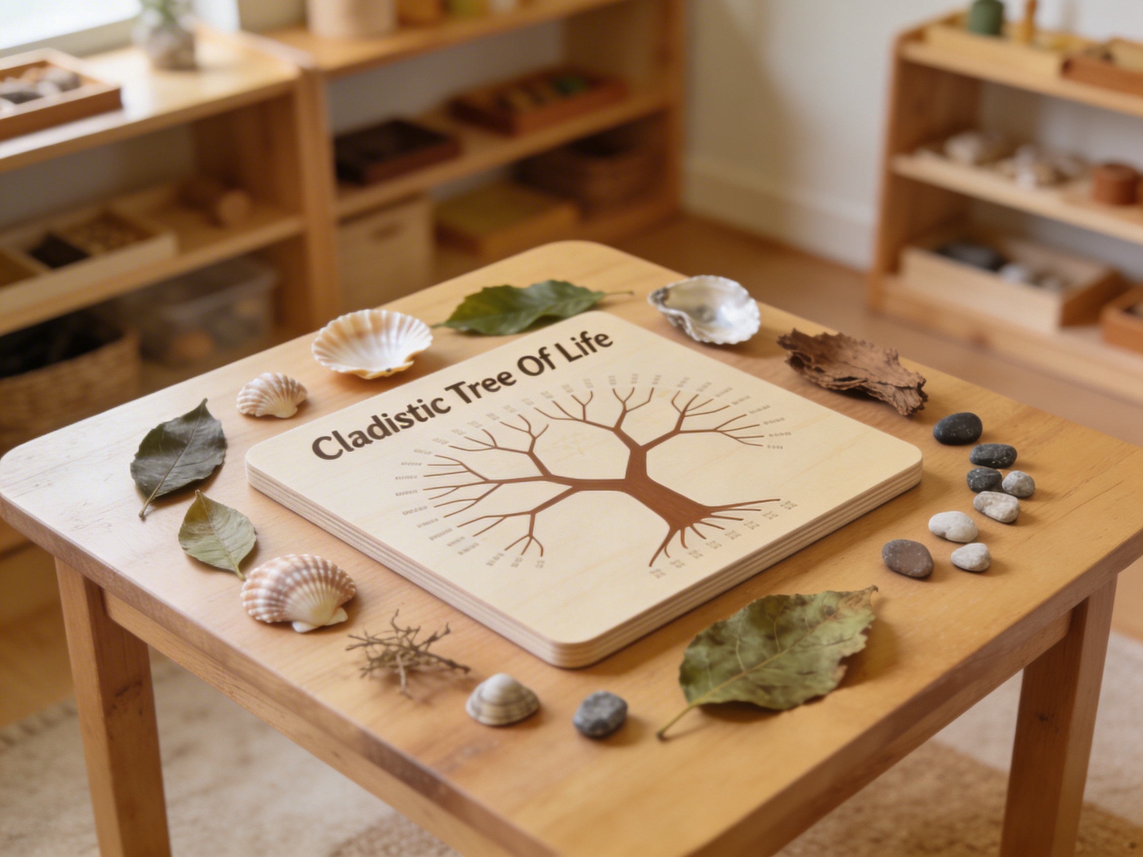 The Cladistic Tree of Life transforms abstract evolutionary concepts into concrete visual relationships that young children can trace with their fingers. This branching diagram addresses the child's natural tendency to classify and organize their world by presenting life forms in a logical, interconnected structure. Each illustrated branch of the Cladistic Tree represents millions of years of evolution, yet the visual presentation makes these vast timescales accessible to the young mind. The material's sophisticated branching pattern mirrors the child's own developing ability to understand relationships and connections between different elements in their environment. By presenting evolutionary relationships through clear visual pathways, the Cladistic Tree satisfies the child's need for order while introducing scientific classification systems. The illustrated organisms on each branch provide concrete examples that anchor abstract evolutionary concepts in recognizable life forms, bridging the child's immediate experience with scientific understanding.