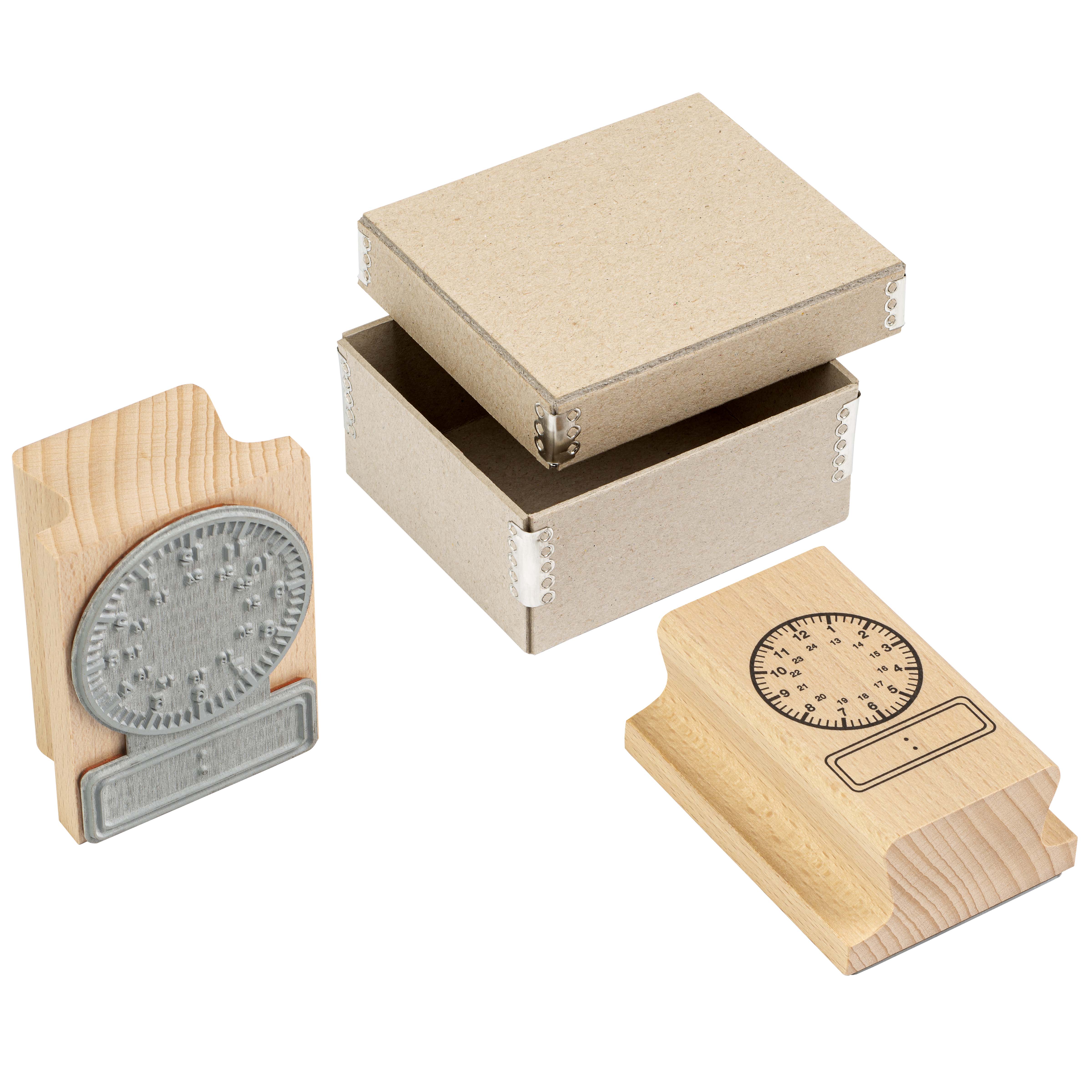 The set includes two wooden stamps - one featuring an analog clock face and another showing digital time display. Both stamps come in a hinged wooden storage box for easy organization and storage.