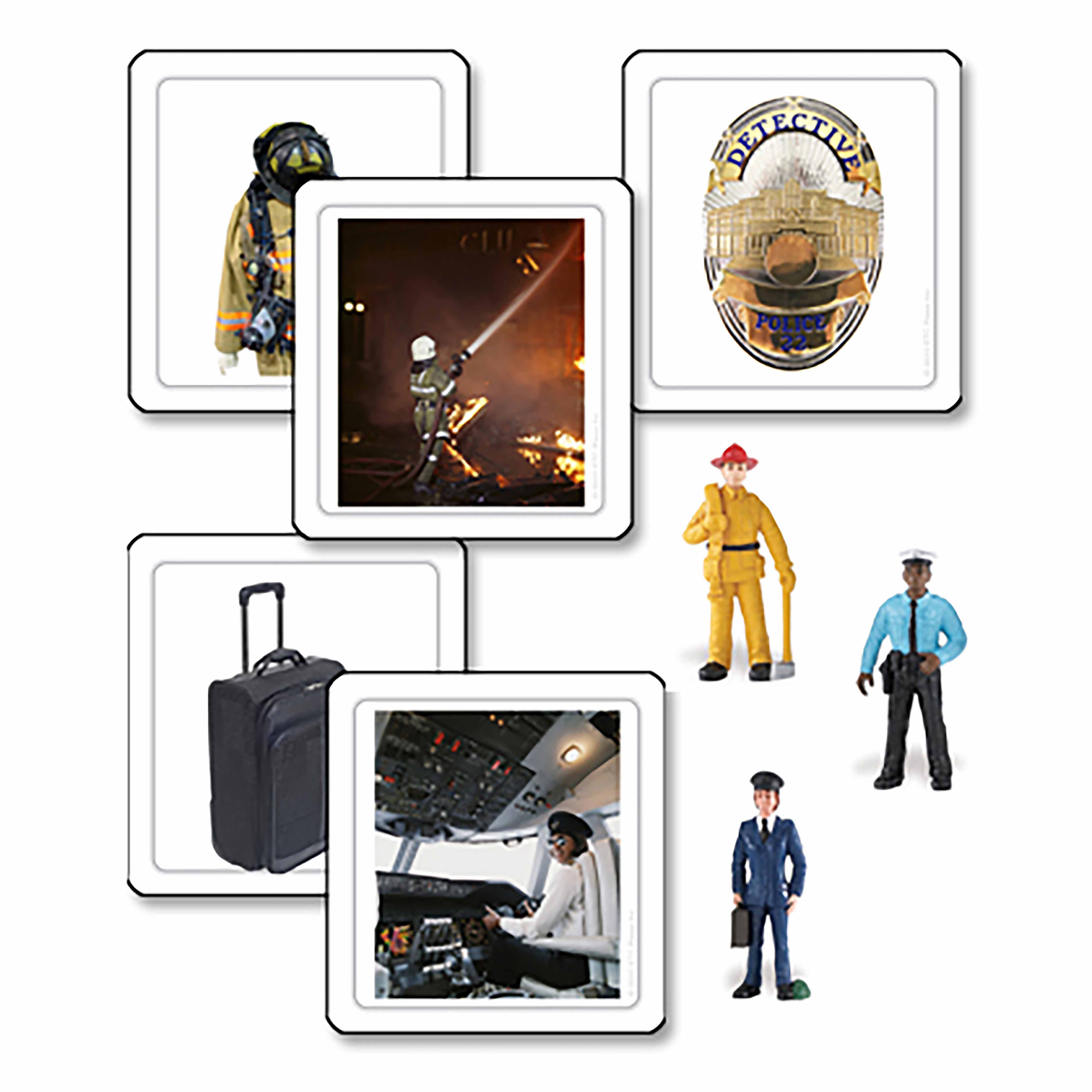 Children examine the realistic figurines, then match them to corresponding photo cards showing that helper's tools, workplace, or actions. For example, they might match the firefighter figurine to cards showing a fire truck, fire station, or someone using a fire hose, building multiple connections for each occupation.
