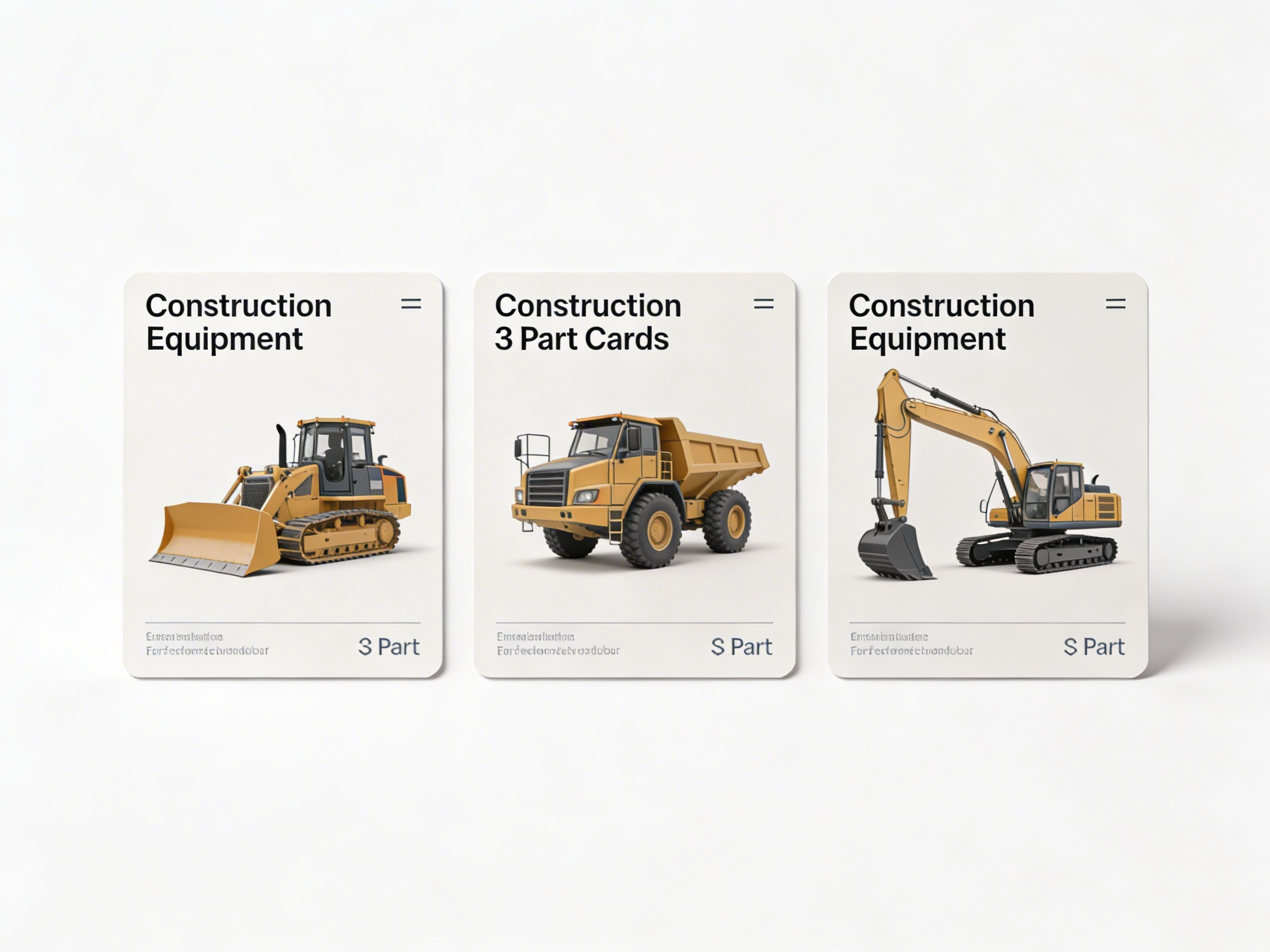 This Construction Equipment 3 Part Cards set introduces children to the vocabulary and visual recognition of various construction vehicles through the classic Montessori three-part card format. Featuring high-quality images of equipment like compactors and trench rollers, these durable laminated cards support language development and classification skills while fostering an understanding of the built environment.