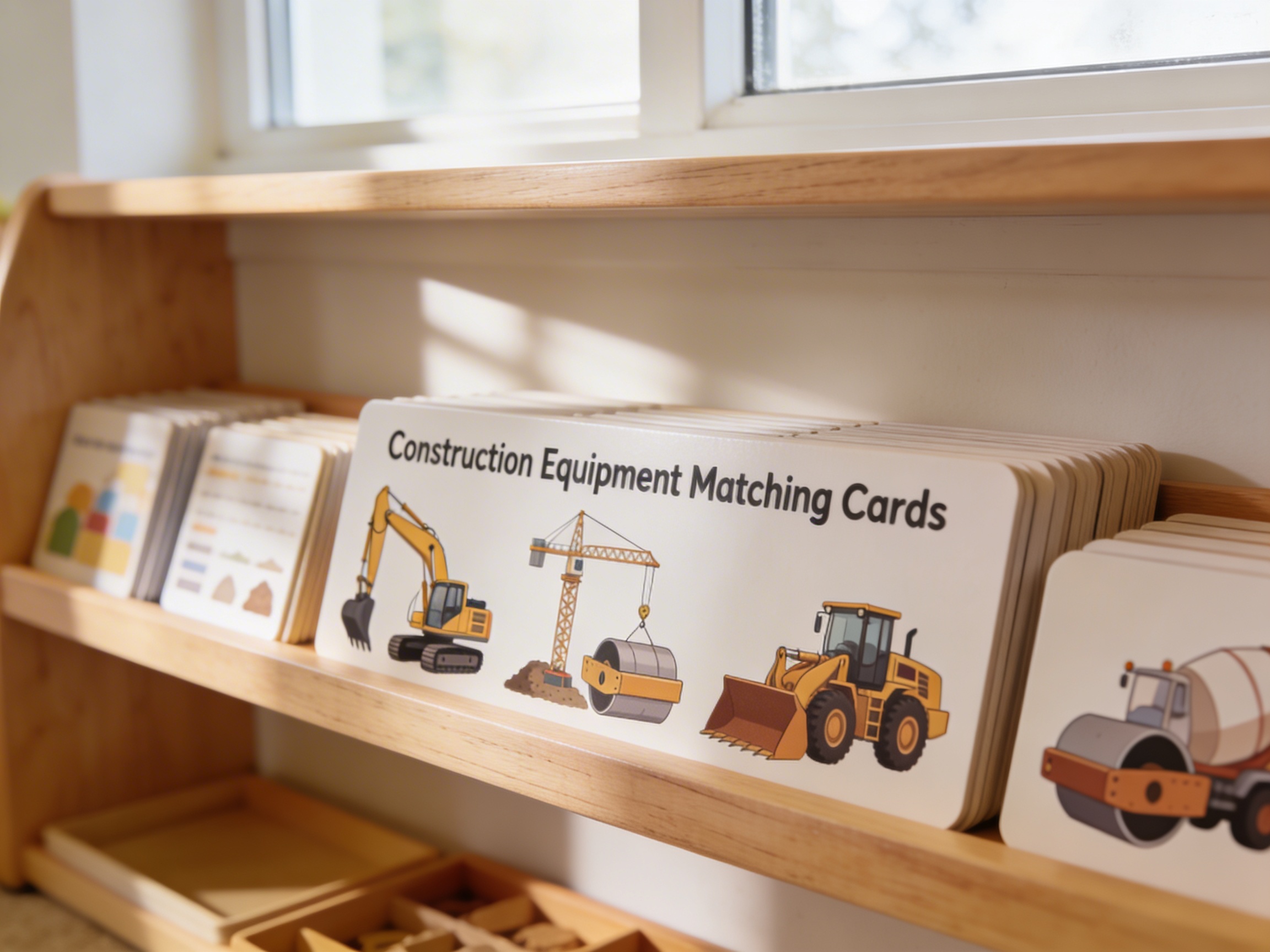 Construction Equipment Matching Cards serve a specific purpose in the Montessori classroom by connecting children's natural fascination with real-world machinery to foundational cognitive skills. The photographic images on each laminated card present construction vehicles exactly as children might observe them in their environment, honoring the Montessori principle of reality-based learning. Through matching orange-bordered cards with their blue-bordered pairs, children engage in purposeful discrimination work that builds neural pathways for categorization and visual analysis. The color-coded borders on these matching cards provide just enough guidance to promote independence while maintaining appropriate challenge for three to six-year-olds. Unlike abstract matching exercises, these construction vehicle cards capitalize on children's intrinsic motivation to understand powerful machines they see transforming their world. The laminated surface allows repeated handling as children refine their ability to distinguish between excavators, bulldozers, and cranes through careful observation of authentic photographic details.