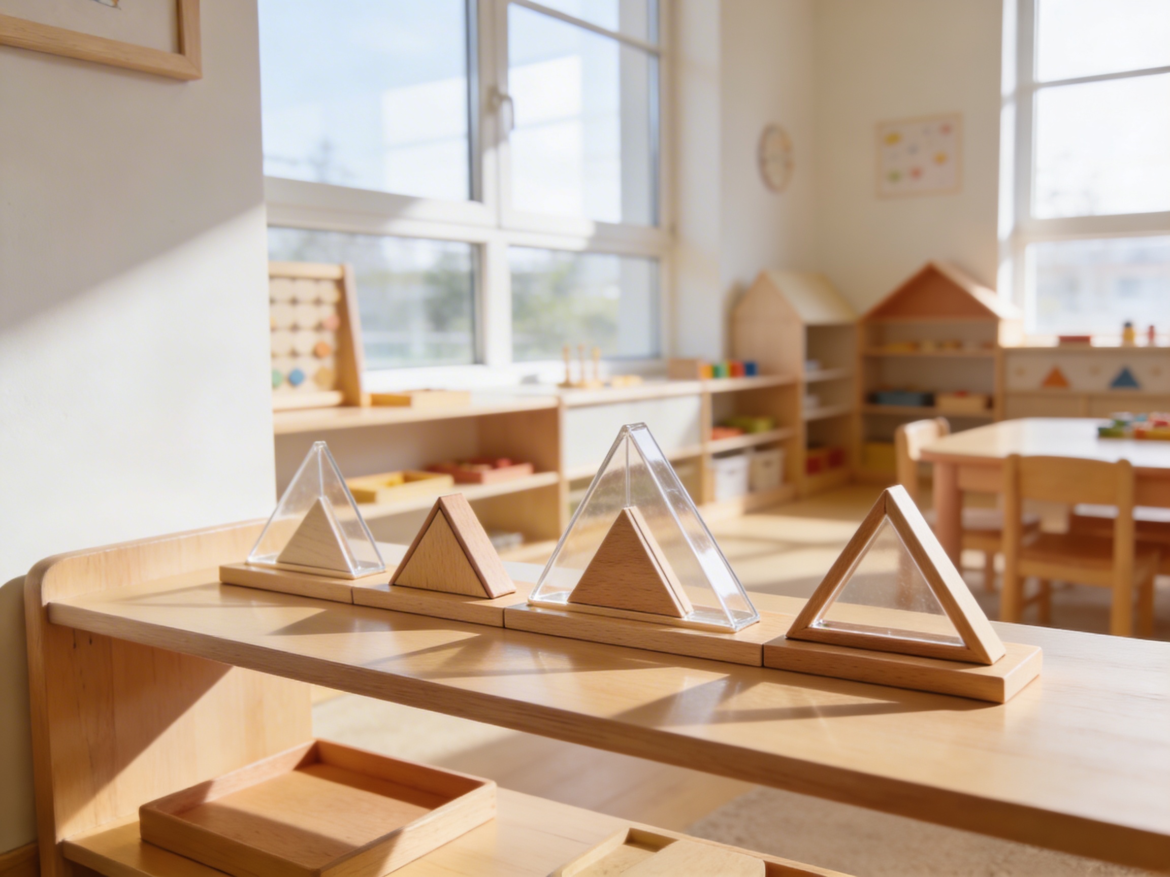 The wooden storage boxes protect the triangles while teaching organization and care of materials, an essential aspect of Montessori education.