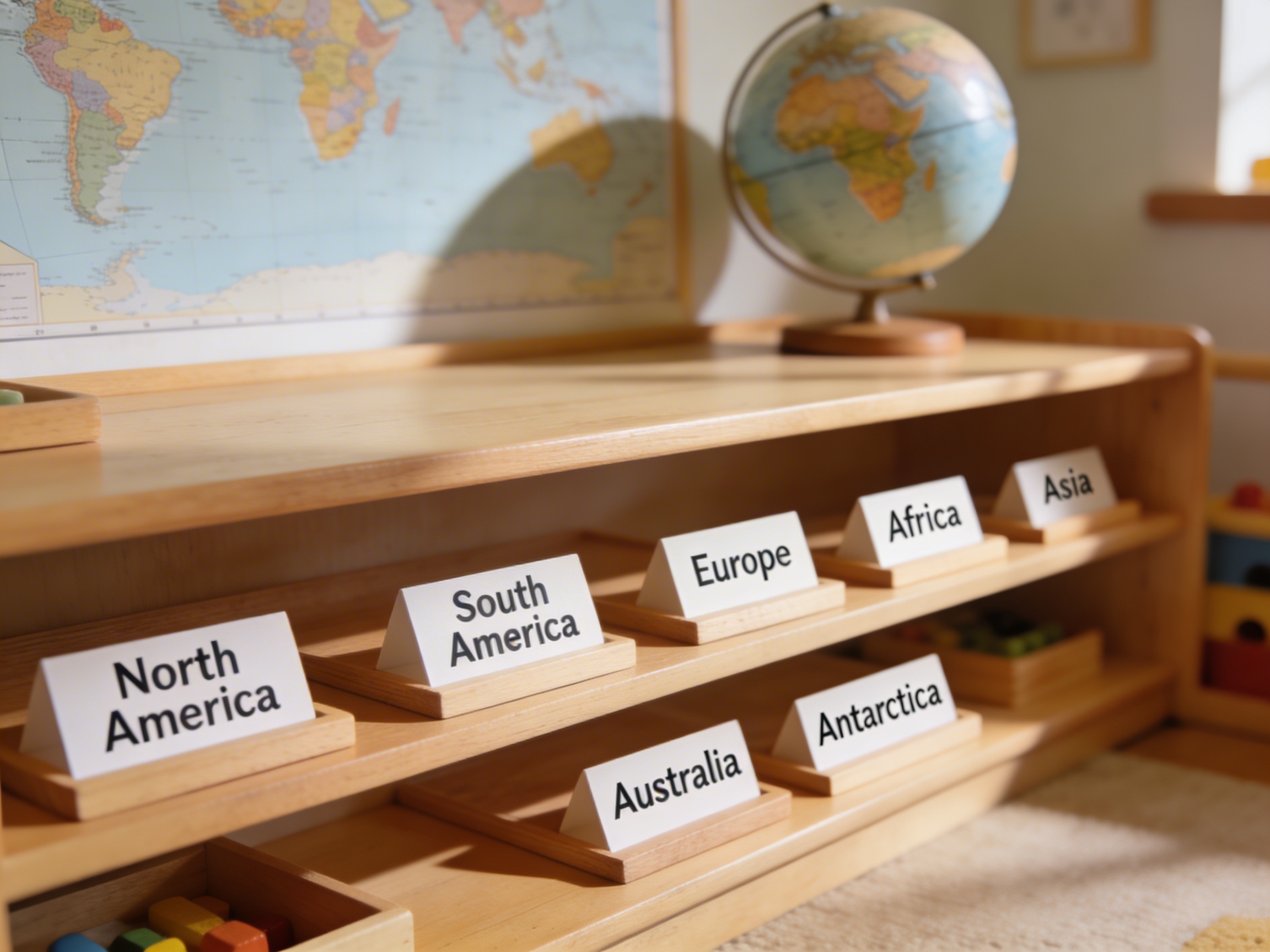 While designed for ages 3-6, continent labels can be introduced around age 3.5-4 when children show interest in geography work and have some letter recognition. Start with matching activities before progressing to reading and writing continent names.