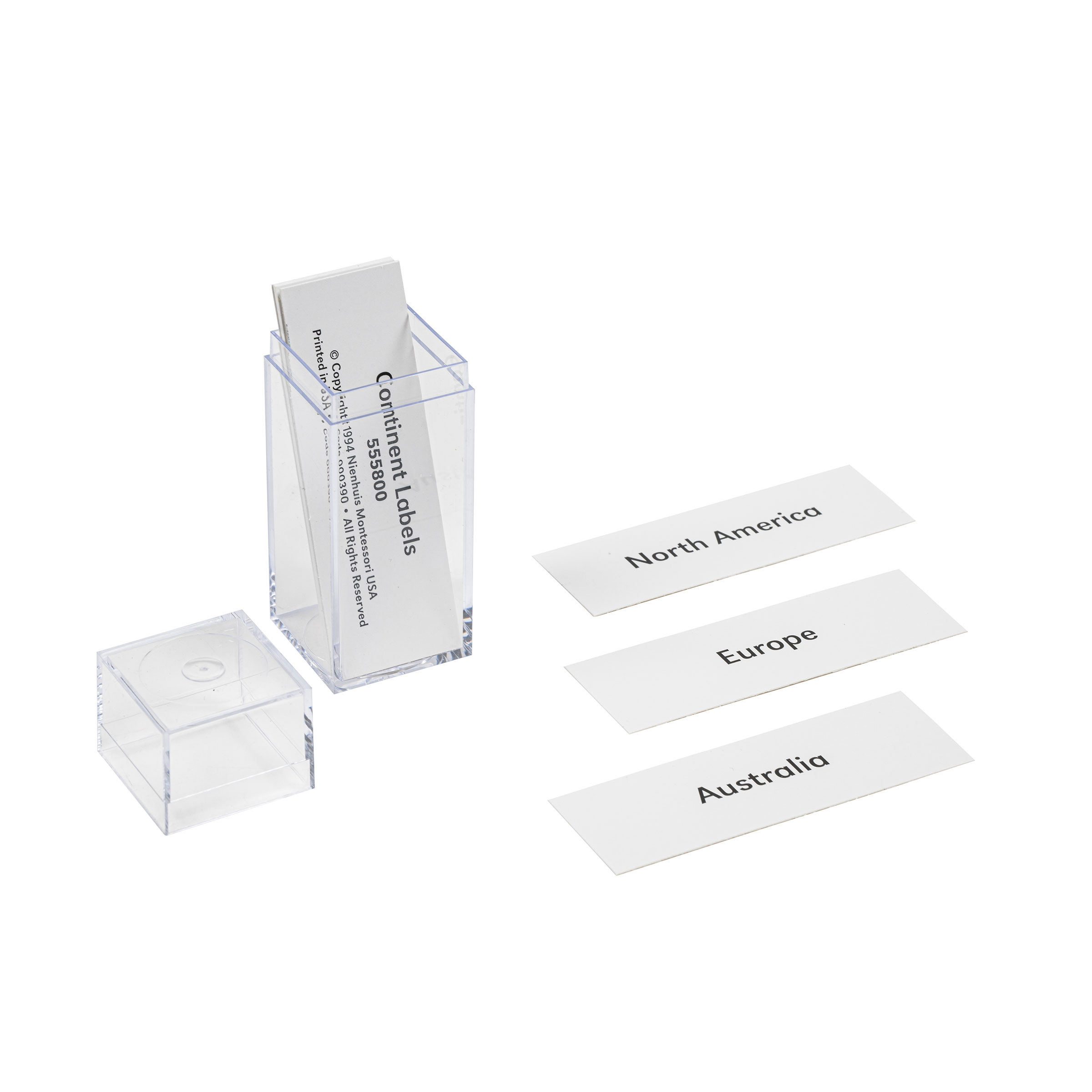 Essential geography material featuring clear, readable continent name labels stored in a practical transparent acrylic box with removable lid. These labels support the child's work with puzzle maps and continent studies, helping to reinforce geographical vocabulary and spatial understanding. The durable storage solution ensures labels remain organized and accessible for repeated use in the Montessori geography curriculum.