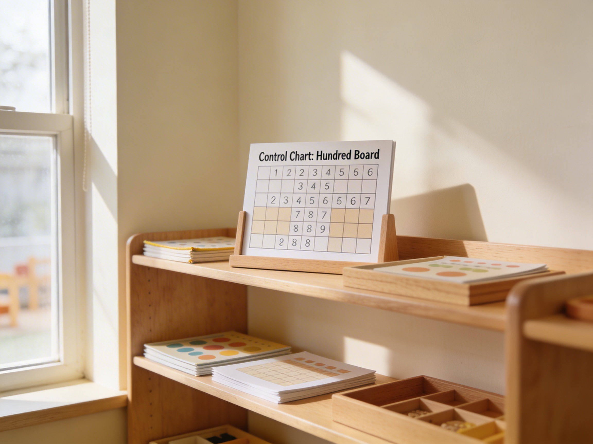 The Control Chart for the Hundred Board embodies the Montessori principle of control of error through its laminated 10x10 grid displaying numbers 1-100. This reference tool allows children to verify their own work independently, eliminating the need for adult correction. The chart's visual organization in rows of ten reveals the structure of our decimal system, while its placement alongside the Hundred Board creates a complete self-correcting system. When children arrange physical number tiles and compare them to this control chart, they engage in concrete manipulation followed by abstract verification. The laminated surface withstands repeated handling as children trace numbers with their fingers, building muscle memory alongside numerical understanding. This control chart transforms number learning from memorization into discovery, as children identify patterns, skip count, and explore mathematical relationships through visual comparison.