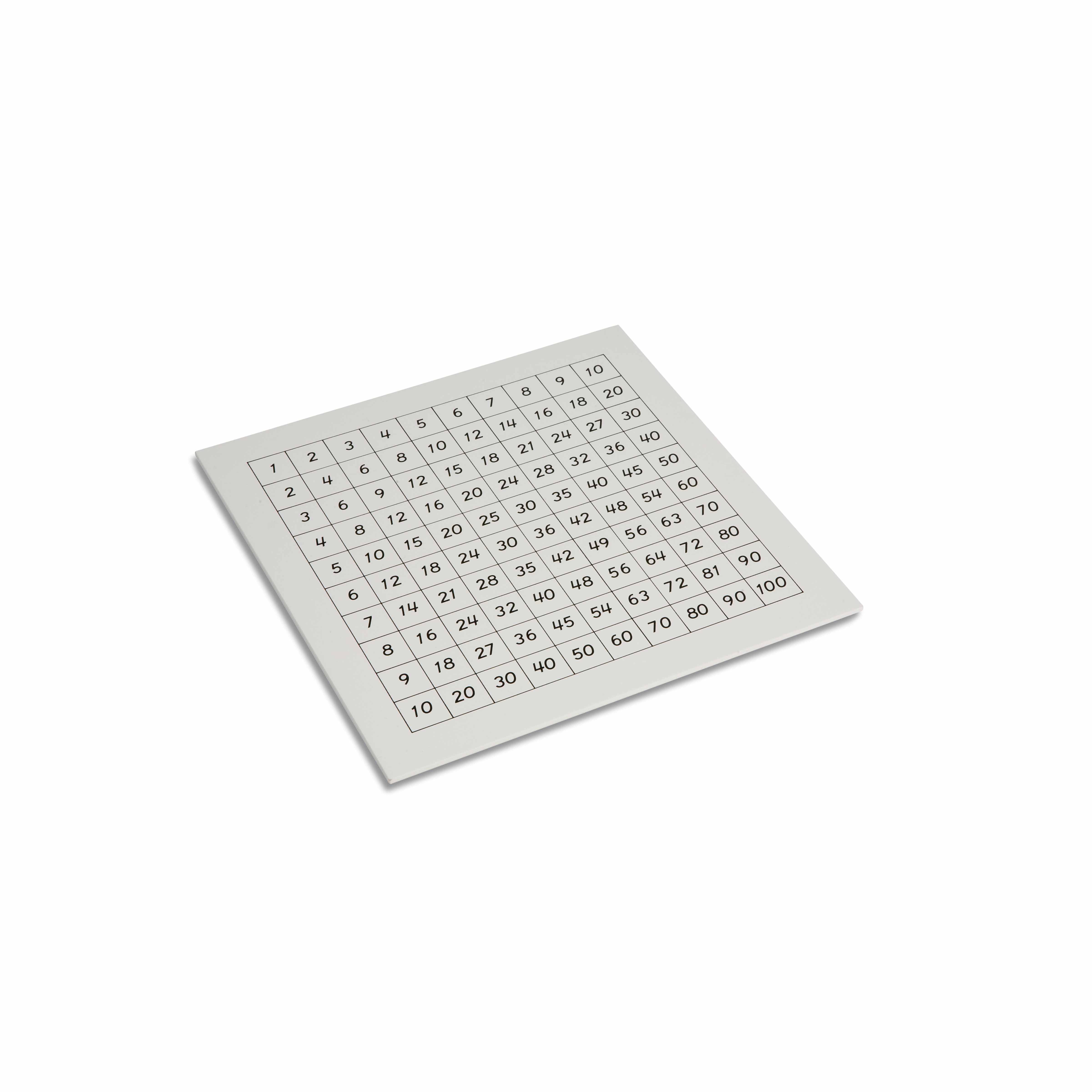 This laminated control chart serves as an essential reference guide for the Pythagoras Board material, displaying the complete multiplication table in a clear 10x10 grid format. The durable chart allows children to verify their work independently when exploring multiplication patterns, supporting the development of mathematical abstraction and self-correction skills fundamental to Montessori mathematics education.