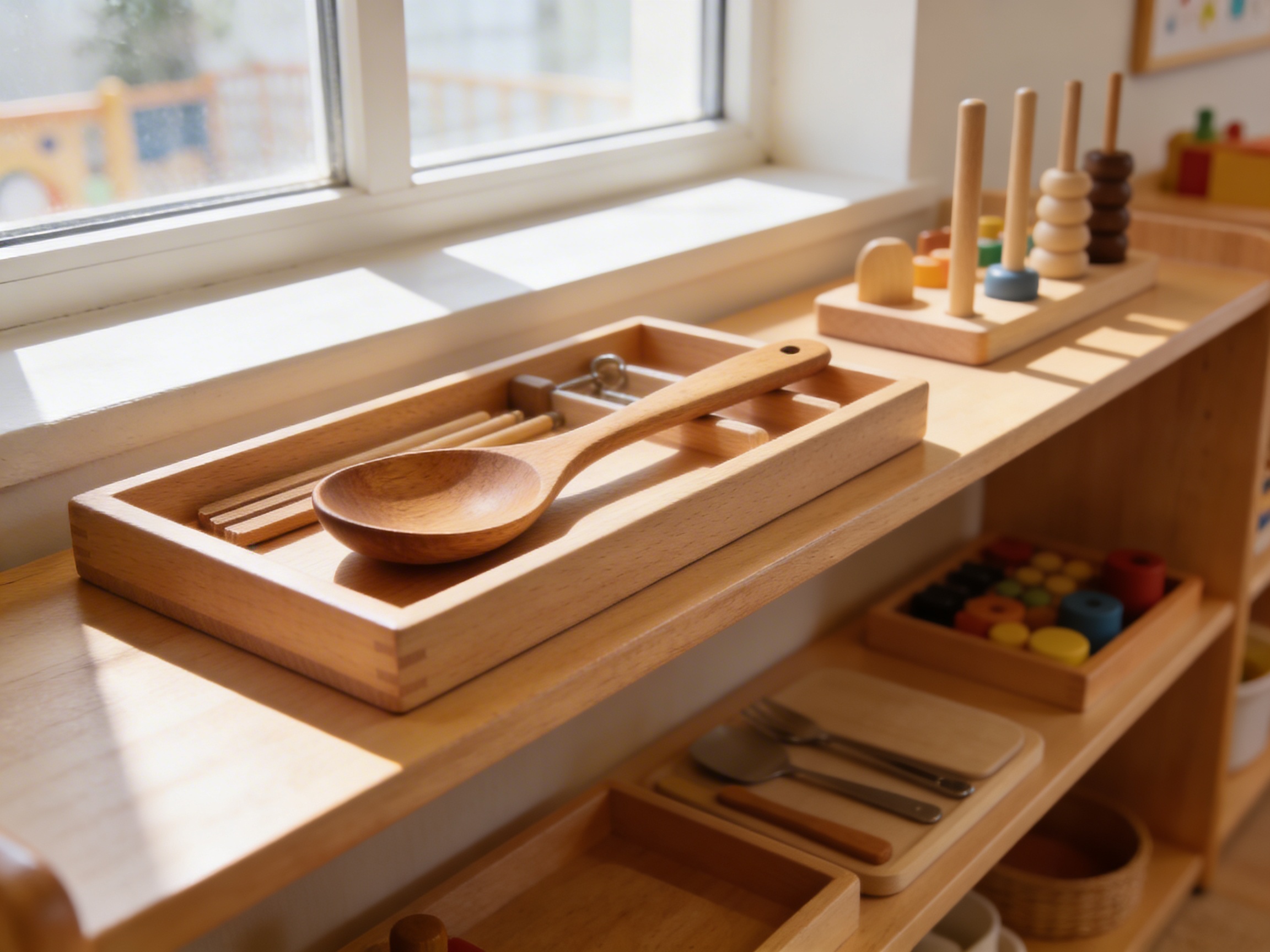 “Store the wooden spoon at child height in the practical life area near other real cooking tools”