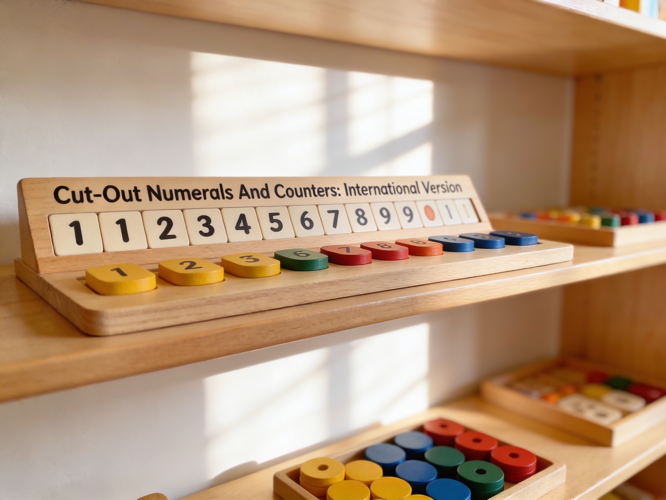 The Cut-Out Numerals And Counters: International Version is a Educational Materials Montessori material designed for children aged 3-6, crafted by Nienhuis Montessori to AMI standards.