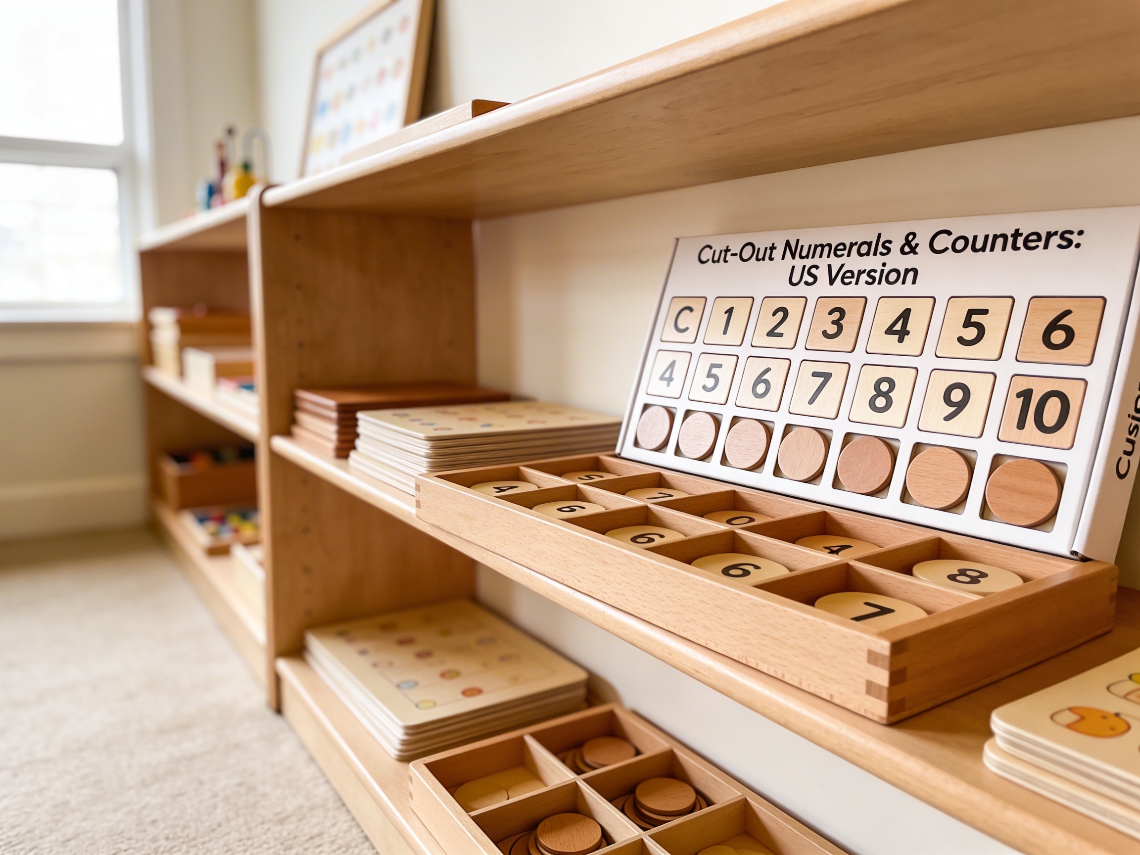 This essential Montessori mathematics material introduces number symbols and quantity relationships through hands-on exploration. The US Version features cut-out numerals 0-9 in vibrant red, paired with smooth circular counters for one-to-one correspondence activities. Stored in a compartmentalized wooden box, this material supports the development of number recognition, counting skills, and the foundation for mathematical operations.